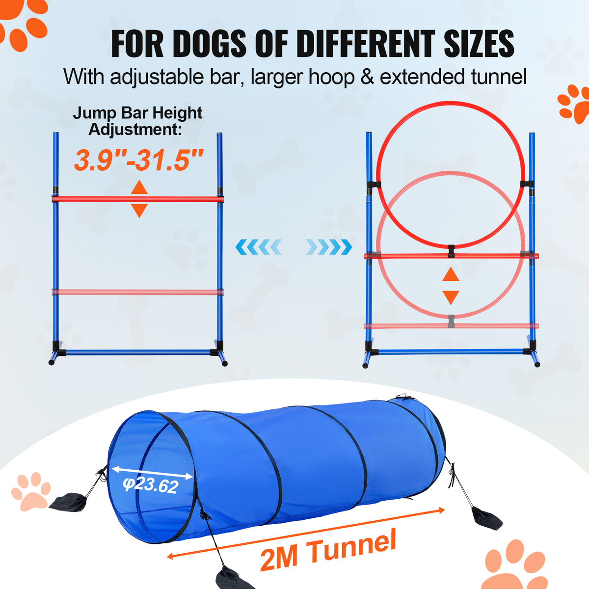Enhance Your Dog’s Agility: Our set includes 27.95-inch wide jump rods, a 23.62-inch diameter jump ring, 6 base poles, a 78.74-inch long tunnel, and a pause box, designed to improve your dog’s agility and obedience while strengthening your bond in a fun and engaging way.