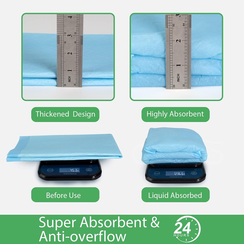 DEEP DEAR's dog pads are much more absorbent than most potty pads for dogs. And its water absorption speed is also very fast. Each pee pad features enough wet-lock gels (SAP).
