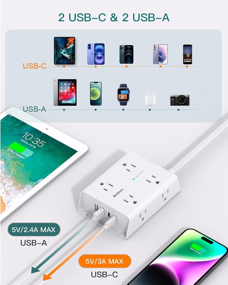 Power Strip with USB Ports - Added extra 2 USB and 2 USB C ports for your devices. The USB C ports can charge up to 5V/3A. USB-A ports can charge up to 5V/2.4A Max. With smart charging technology, they can auto-detect your devices and can reach faster charging efficiency. Perfectly fit for cellphones, laptops, tablet, earphones etc.