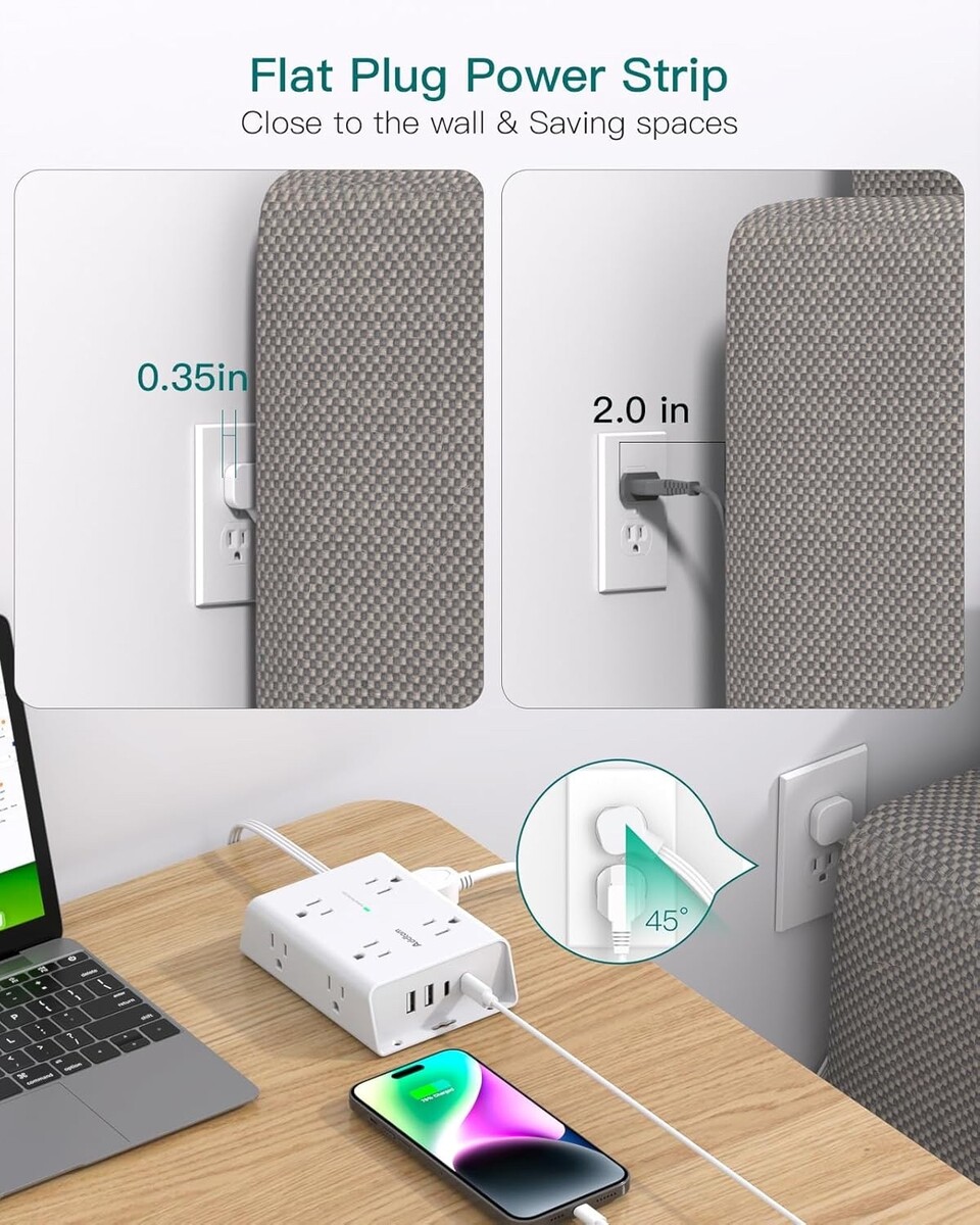 12-in-1 Mountable Power Strip - Our flat Plug power strip turns 1 socket into 8 AC outlets 2 USB-A and 2 USB-C, which can charge up to 12 devices simultaneously. Screw fixation design on both ends allows this white power strip to be securely installed in various applications (4 screws included). Making your desktop organized
