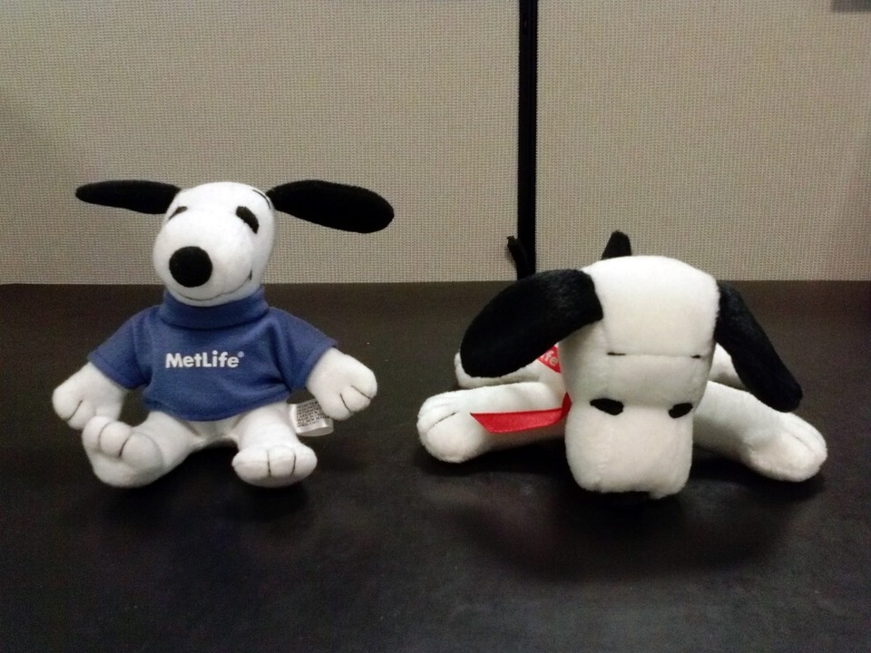 Two plush Snoopy dolls. Promotional items from MetLife. From a pet free, smoke free office.