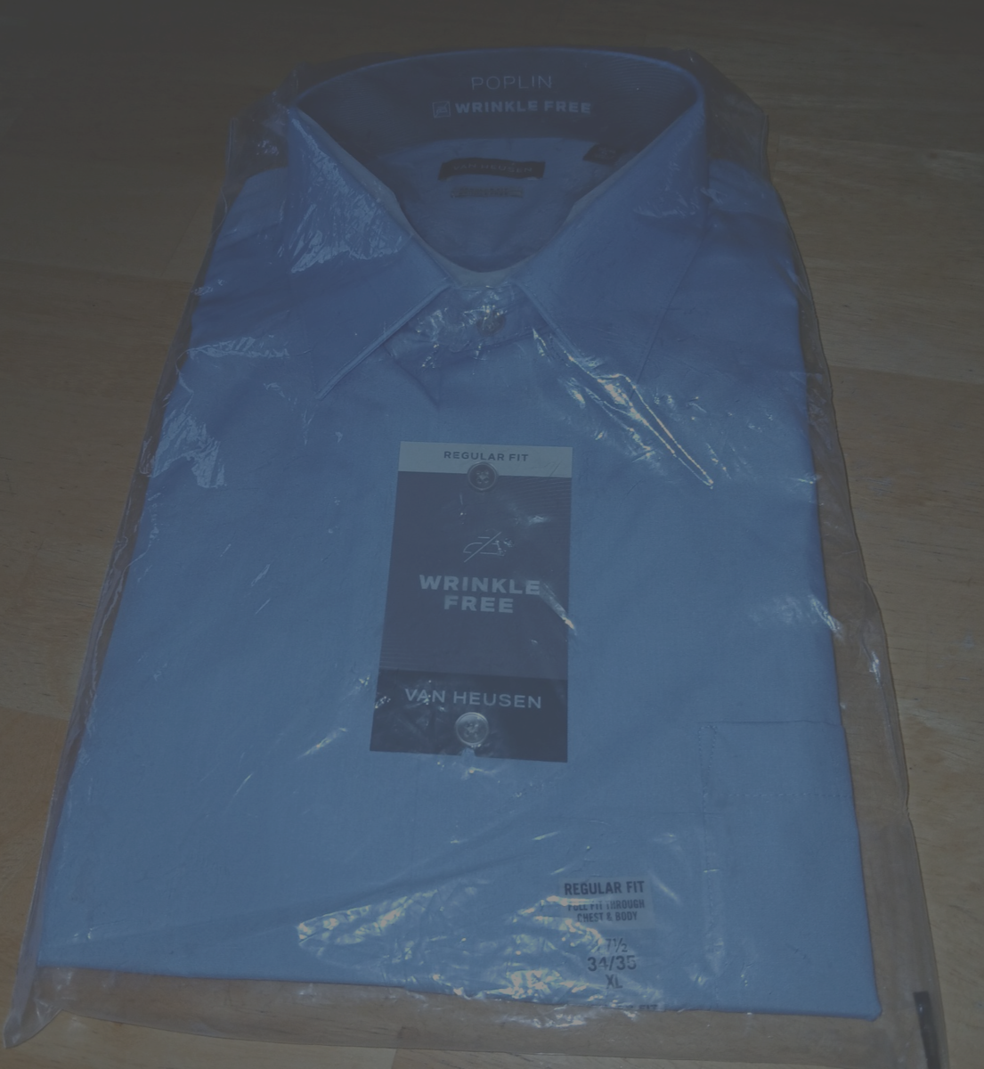 THIS IS A NICE MEN'S VAN HEUSEN WRINKLE FREE/REGULAR FIT LONG-SLEEVED BLUE DRESS/BUSINESS SHIRT IN A SIZE XL (17 1/2 x 34/35). IT IS NEW, IN THE PACKAGE, AND PRICE TAG OF $45.