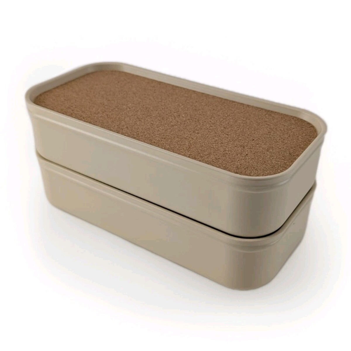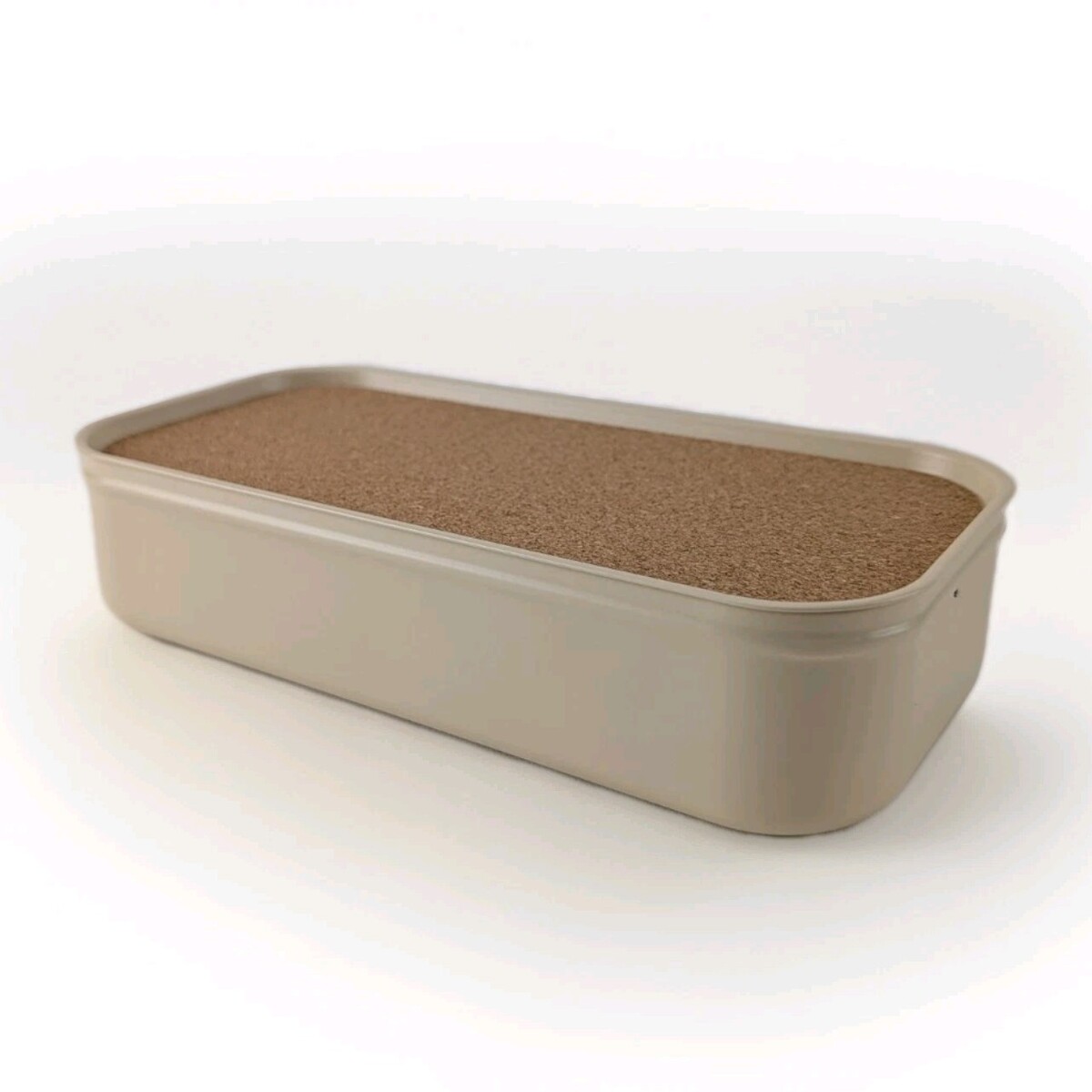 Durable metal box with a cork lid on top that makes it easy to stack several boxes on top of each other, without scratching them, to keep everything in one place.