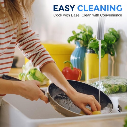 * NON-STICK COATING: The PTFE/PFOA/PFOS-free non stick pot set cooking ware features a long lasting nonstick coating for easy food release or tossing, cleaning healthy cooking w/ heat resistant lacquer exterior making it resistant to high heat
