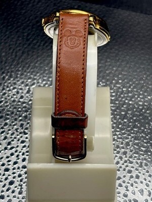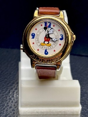 The Lorus Musical "Happy Birthday Song" Analog Watch is a unique timepiece that features a cartoon dial pattern with Arabic numerals. This vintage watch from the 1980s boasts a gold bezel and case color, with a two-piece leather strap in brown. The watch is a quartz movement with a 10m water resistance and comes with a buckle closure. Made in Japan, this classic watch is perfect for casual occasions, adding a touch of nostalgia and music-themed charm to any outfit.