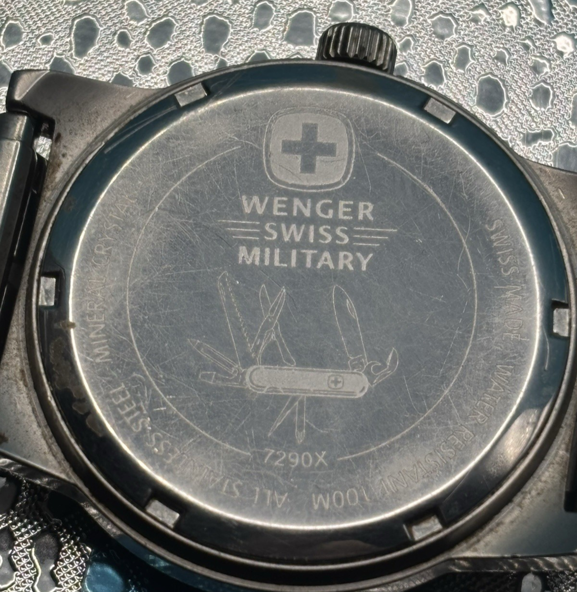 The Wenger Swiss Military 7290X Field Watch is a vintage timepiece with a classic round shape and a stainless steel case. Featuring Arabic numerals on a white dial, this watch is designed for military use with a water resistance of 100 meters. The wrap-around strap and screwback caseback add to its rugged design, while the quartz movement ensures accurate timekeeping. Made in Switzerland, this watch exudes a sturdy, reliable style suitable for everyday wear.