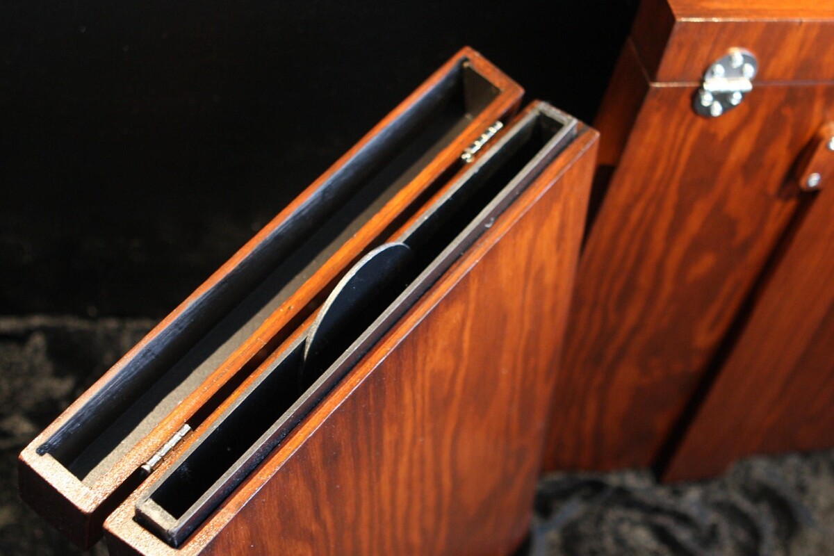 This is brand new Wet Plate Collodion 11x14 Kit for really big plate. This kit contains: Silver Bath box with dipper, Fixer Bath box with dipper and drying rack. Both inner baths are made of black PVC, the front plate of the fixer bath box is made of 4 mm clear plexiglass. Exact inner dimensions (416 x 302 x 15 mm). Both inner baths are removable from the outer containers for easier cleaning. Both dippers are made of hard black PVC. Both outer containers are wooden and lacquer painted with dark "mahogany" color on outer side. Both containers are hinge covered and provided with back bracket for fixation of the bath in optimum inclined position. If you prefer different dimensions, please contact me and I can make bath box of any size you want.