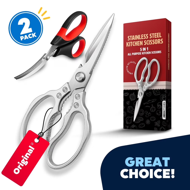 2-Pack Kitchen Scissors Set: Includes one heavy-duty stainless steel multipurpose kitchen shears and one premium seafood scissor. Heavy Duty Kitchen Shears: Designed to handle tough cutting tasks with ease, these kitchen scissors are made from high-quality materials for durability. Perfect for cutting through meats, poultry, fish, and bones High Grade Material Quality: Crafted with premium stainless steel, these kitchen scissors ensure longevity and are built to withstand regular use Unique Blade Design: Features a specialized blade design that allows for easy cutting through bones, providing smooth and precise cuts every time. Ideal for both experienced cooks and beginners Ergonomic Handle: The comfortable grip of the ergonomic handle reduces hand fatigue during extended use, making it easier to tackle both quick tasks and longer projects Utility Scissors: Versatile enough for various kitchen tasks, from snipping herbs to cutting open food packaging, these scissors are an essential tool for any kitchen