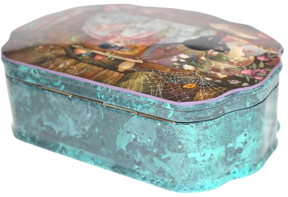 Russian Lacquer box By the very talented artist Alexander Maslov in this work he features the classic tale of Baba-Yaga . Maslov is a graduate of the Fedoskino art school.. Any white patches in the photos are from the camera's light reflection. The box is signed by the artist Maslov on the lid of the box .Alexander Maslov is the talented Fedoskino artist who is able to make the magic world of a Russian fairy-tales come true. His favorite heroine of a Russian fairy-tale is the forest witch, Baba-Yaga and he likes to depict this heroine in his unique compositions. Alexander is the oldest brother in the Maslovs family, his younger brother Vladislav is also well-known talented artist.