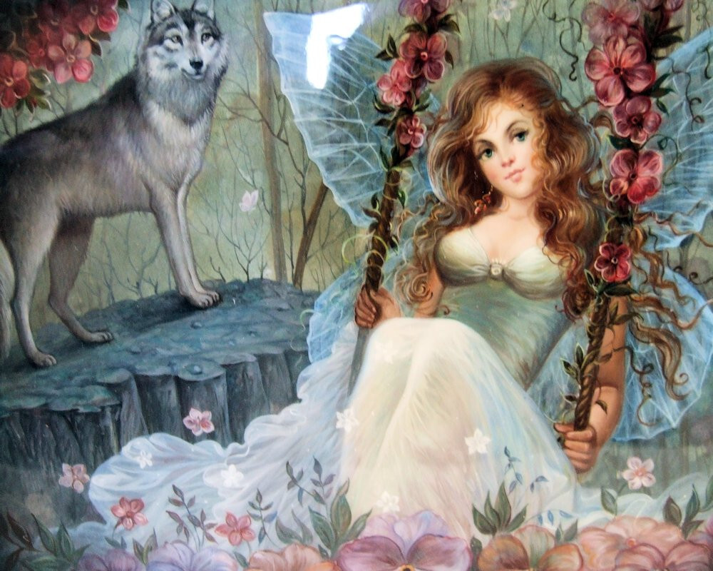 a wolf onlooking in the background. On the Fairy's dress you can see the art of mother of pearl incorporated in the box with the forest in the background. The box is hand painted completely