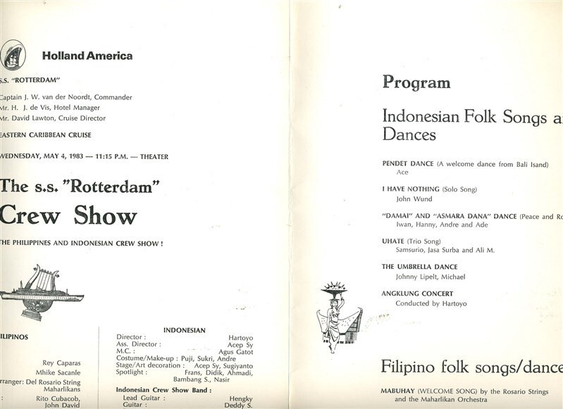 A colorful single page Indonesian Lido Luncheon Menu and 4 page Holland American Cruises Program from a Crew Show and Indonesian Folk Songs and Dances on a 1983 SS Rotterdam Cruise. Both in very fine condition. The menu measures about 8 1/2" x 12" and is blank on the back. With information on the Indonesian Dances on the back cover of the program