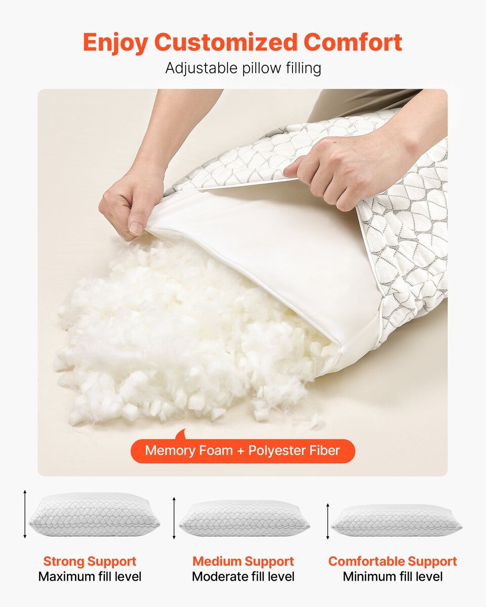 1.Customizable Comfort: This King Size bed pillow is filled with premium memory foam that adapts to your neck curve for ideal support. Extra 1/2 lbs filling allows you to adjust height and firmness for personalized comfort2.Fits All Sleeping Positions: The memory foam of our soft pillow adjusts to side, back, or stomach sleepers, ensuring comfort and improving sleep quality throughout the night3.Neck Curve Support: The supportive pillow conforms to your neck, easing pressure and relieving shoulder and neck fatigue, helping to combat stress-related insomnia for a peaceful sleep4.Breathable, Skin-friendly Pillowcase: Made with natural fiber, the pillowcase absorbs dampness, is soft, breathable, and suitable for all seasons, ensuring long-lasting freshness5.Easy to Clean: The removable pillowcase is machine washable and resistant to shrinking or deformation, making maintenance simple. Our sleeping pillow for daily bedroom use, guest rooms, or as a thoughtful gift King Size Adjustable Memory Foam Pillow This memory foam pillow is soft, comfy, and adapts to your sleeping position, giving you the support your neck deserves. Our bed pillow includes 1/2 lbs of filling to customize your pillow's height and firmness, ideal for different sleep positions and personalized comfort. Our sleeping pillow keeps your neck's natural curve, easing pressure points and supporting changing sleep positions, neck fatigue, and poor sleep quality for restful nights. Natural firber fabric of our soft pillow is moisture-wicking, breathable, and keeps you comfy year-round with a fresh, dry feel. The bedroom pillow is great for bedrooms, guest rooms, or dorms, and makes a thoughtful present for anyone who loves comfort.