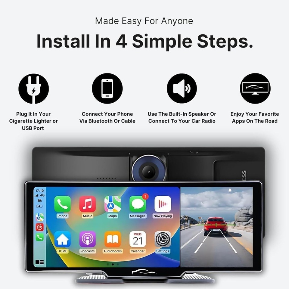 Upgrade your vehicle?s entertainment and connectivity in minutes with this CarTablet Pro Max touchscreen system. This 2026 model features a 10? HD/4K touchscreen display, wireless Apple CarPlay Android Auto support, and a built-in dashcam for recording your drives. This is the basic version ? reverse camera NOT included.