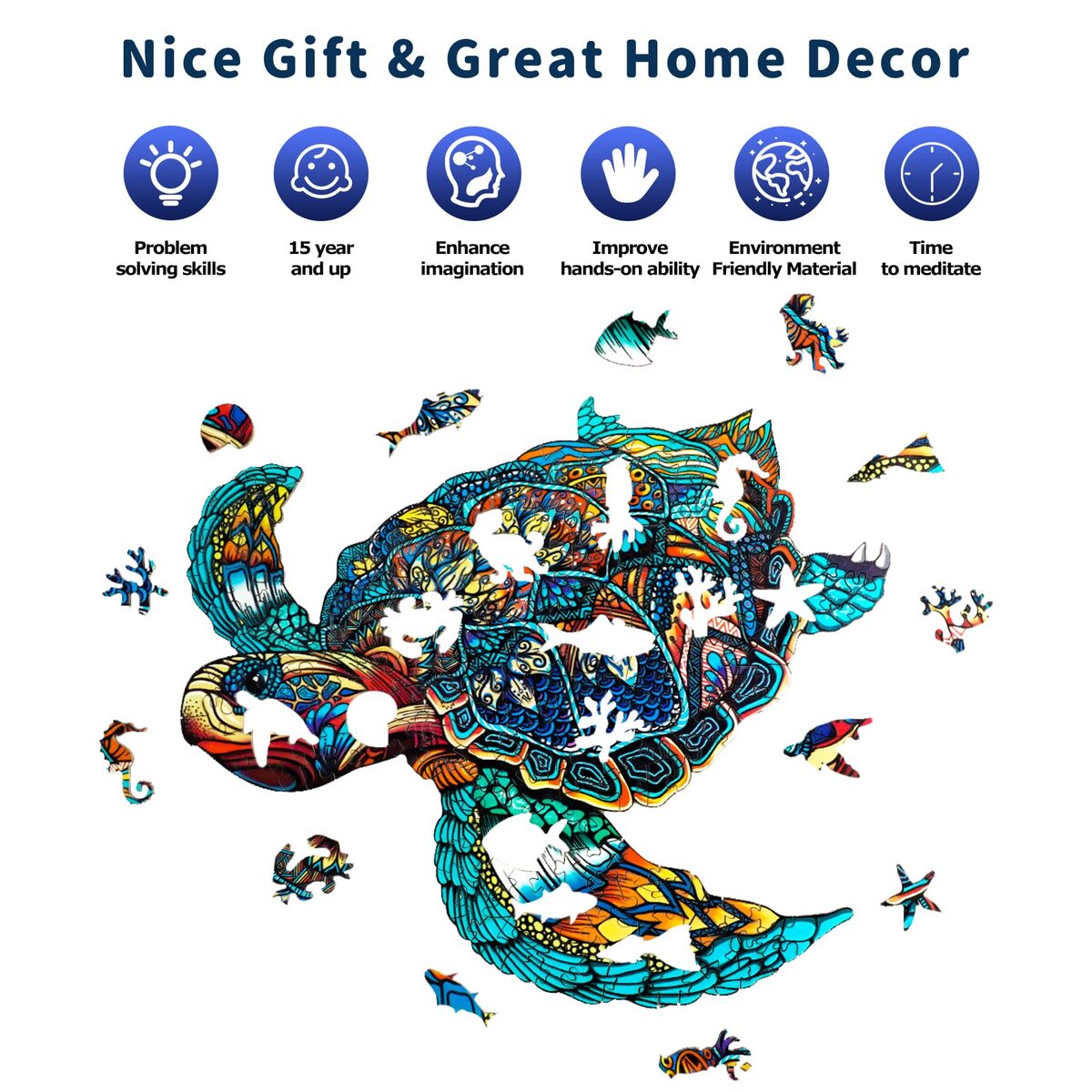 PERFECT GIFT FOR ADULTS KIDS:Still looking for a unique gift for your mom or kids? Sea Turtle Maternal Love wooden puzzles are definitely the best gift choice for your kids, grandma, grandpa, friends on Birthday,Mother's Day , Easter or Special Occasions. Enjoy the joy of finding, and the joy of thinking.,FUN FOR ALL AGES: Choose these wooden animal-shaped puzzles as a way to relieve stress after a long day at work or a way to bond with your friends or family members. The puzzle can promote eyes hand coordination, raise focus, patience, logical thinking, and problem-solving skills.,GORGEOUS COLORS DETAILS:Our wooden jigsaw puzzles with rich print quality and complex laser-cut parts. When your wood puzzle is complete, you can hang it up on the living room as a classy decoration.,NATURE THEMED PUZZLE SET :Enjoy a relaxing time with this Sea Turtle Puzzle! Available in 4 sizes, Including jigsaw pieces made of high-quality natural wood like marine animals and starfish, do not hurt your hands, clear picture, high recognition, no color fading, harmless to human body.,BEST SERVICE GUARANTEE : Buy with confidence! If you are not satisfied with our unique shaped jigsaw puzzles, you can return them at any time. If there are any missing or damaged pieces, Please contact with us by email. We will remake and reship a new one to you. Don't worry.