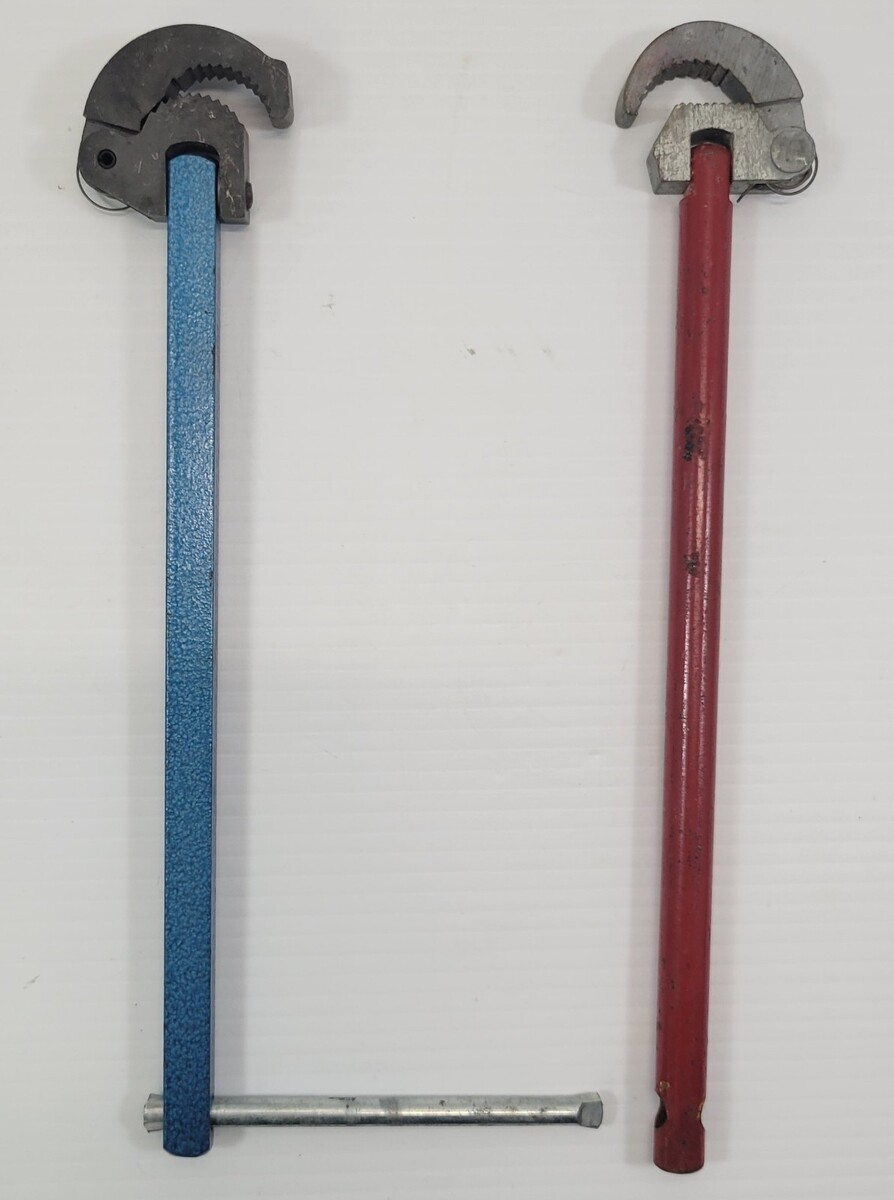 Basin wrenches are in vintage used condition. The red wrench is missing the turn bar rod.