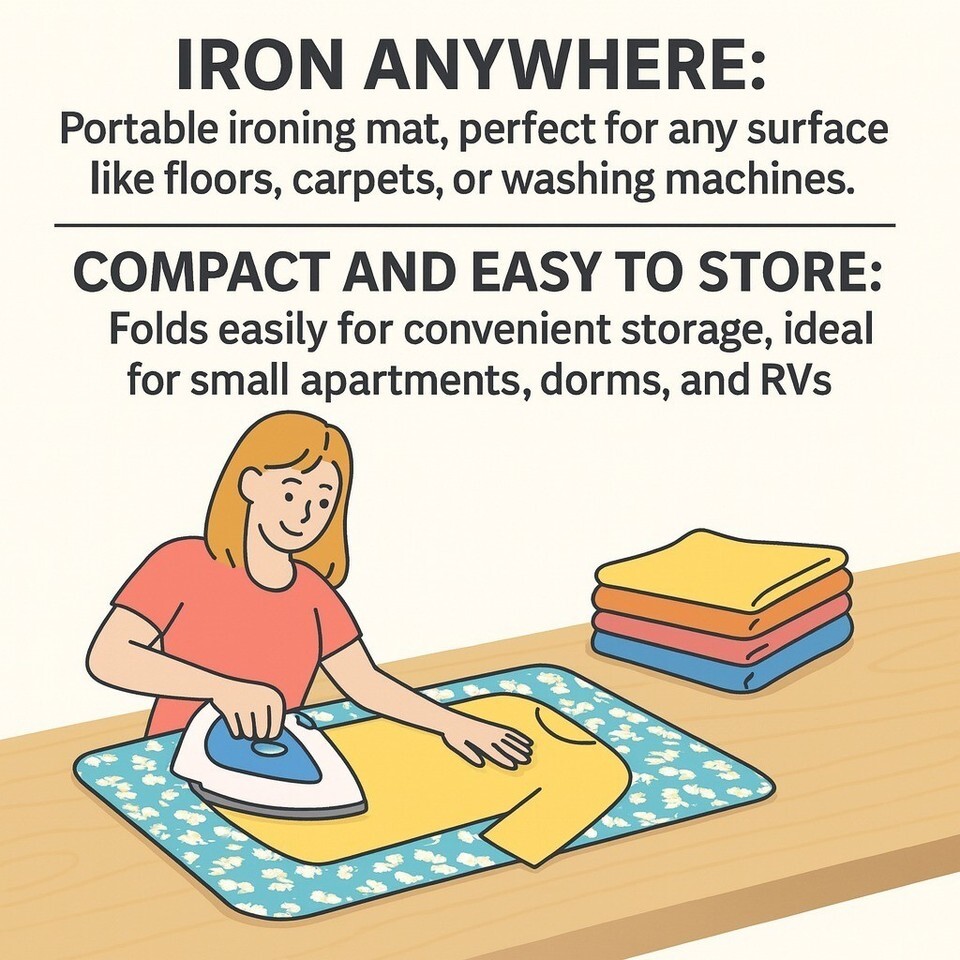 Lightweight and foldable, the mat stores easily in drawers, cabinets, laundry baskets, or travel bags. It is ideal for apartments, dorm rooms, RVs, and other small spaces where a traditional ironing board may not fit. The floral print adds a decorative touch to any laundry or living area.