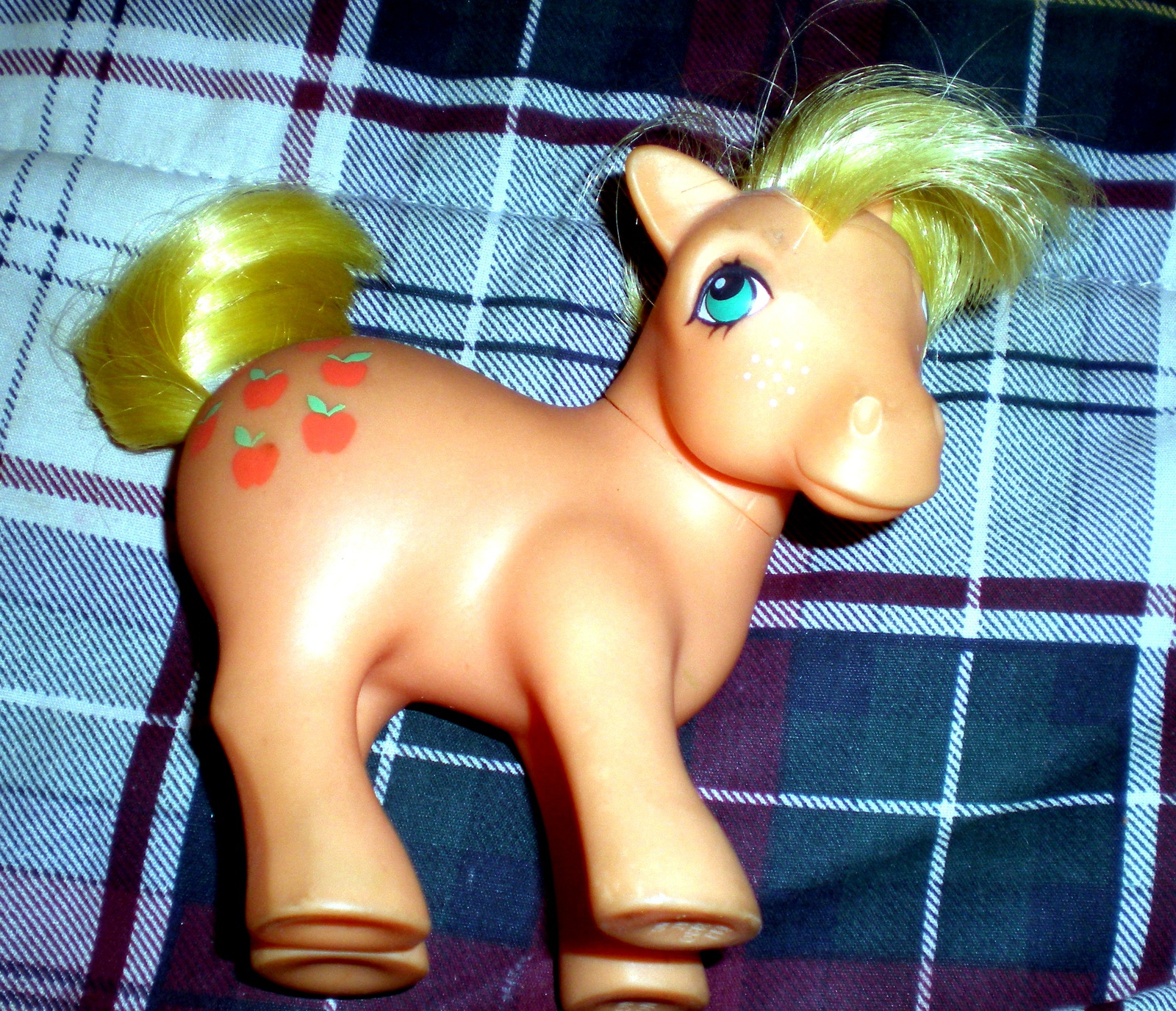 My little Pony is by Hasbro. This pony is pink in color with red apples on both sides, The hair is yellow. This pony needs a light cleaning but overall it's in good condition. This is a used item. If you have any questions please e mail me thanks