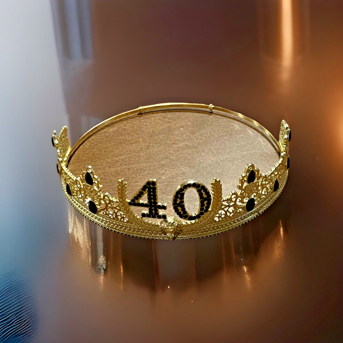 This product is a gold crown tiara featuring onyx bling, designed for women celebrating their 40th birthday. The tiara is made of metal and polyester, with dimensions of 7 inch diameter and 2 inches in height It is a stylish accessory perfect for a special birthday party or formal occasion, with a theme of royalty and a touch of glamour. This elegant tiara is a unique and eye-catching addition to any outfit.