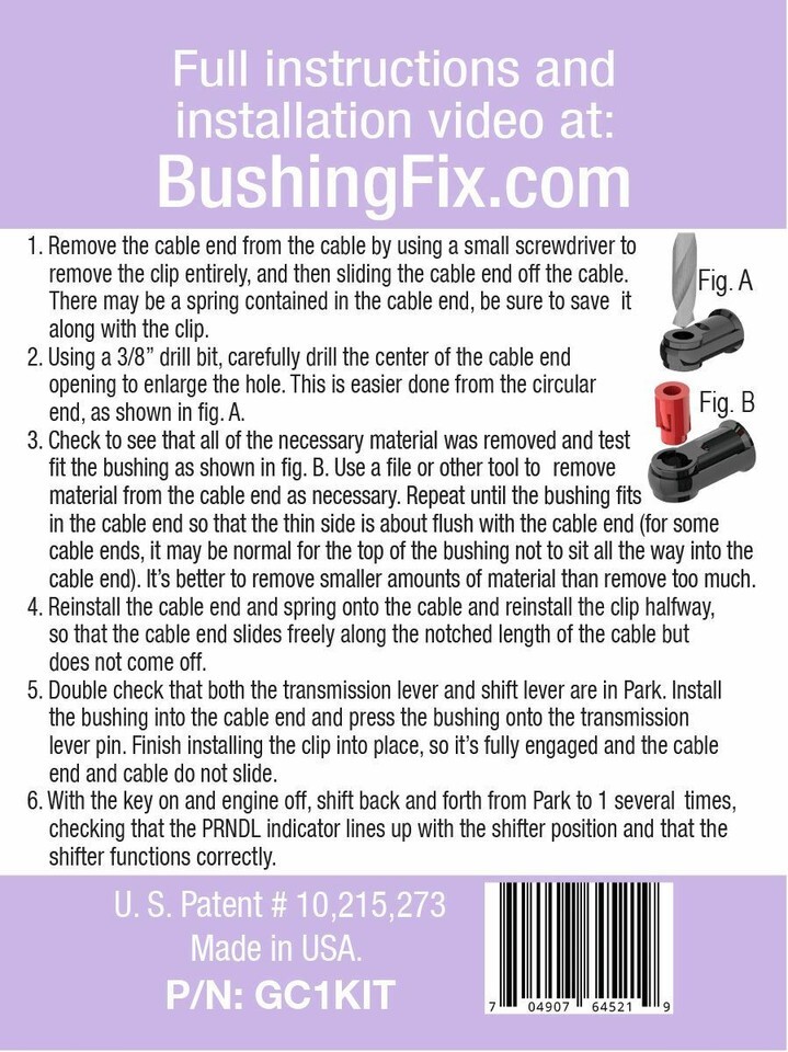 GC1KIT? kit (US patent #10,619,723 and #10,215,273) allows you to quickly and easily repair your automatic transmission shift cable by repairing the cable end that attaches to the transmission shift lever. This particular cable style does not have a bushing but rather plastic prongs that break over time. Our patented replacement sleeve comes complete with replacement prongs and ensures a quality repair with ease. A professional can perform this repair in under 5 minutes, average time for a non-professional is less than 15 minutes. This kit is made from a material that was designed to outlast the factory cable end. You will need a drill and 3/8" bit to complete the repair. Bushing Fix GC1KIT?- Transmission Shift Cable Bushing Repair Kit ?; (US Patent # 10,215,273 and US Patent # 10,619,723).