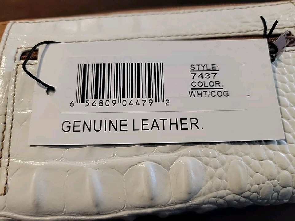 This Madi Claire purse is a stylish addition to any outfit. The embossed "Croc" leather pattern gives it a unique look, while the double turn lock closure ensures your belongings stay safe. The brown leather handle/strap adds a touch of warmth to the white exterior, and the gold hardware color complements any outfit.