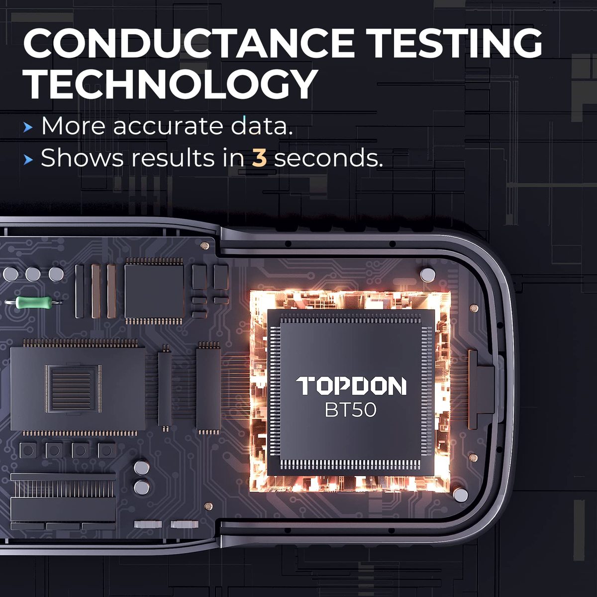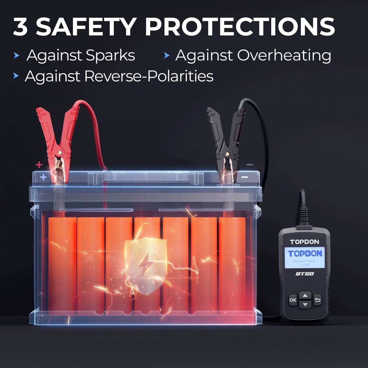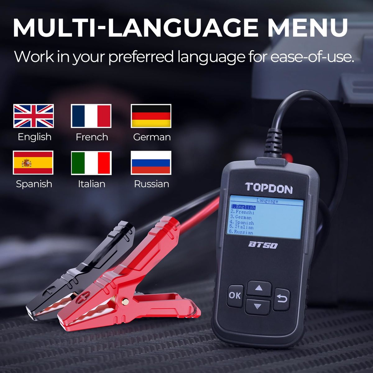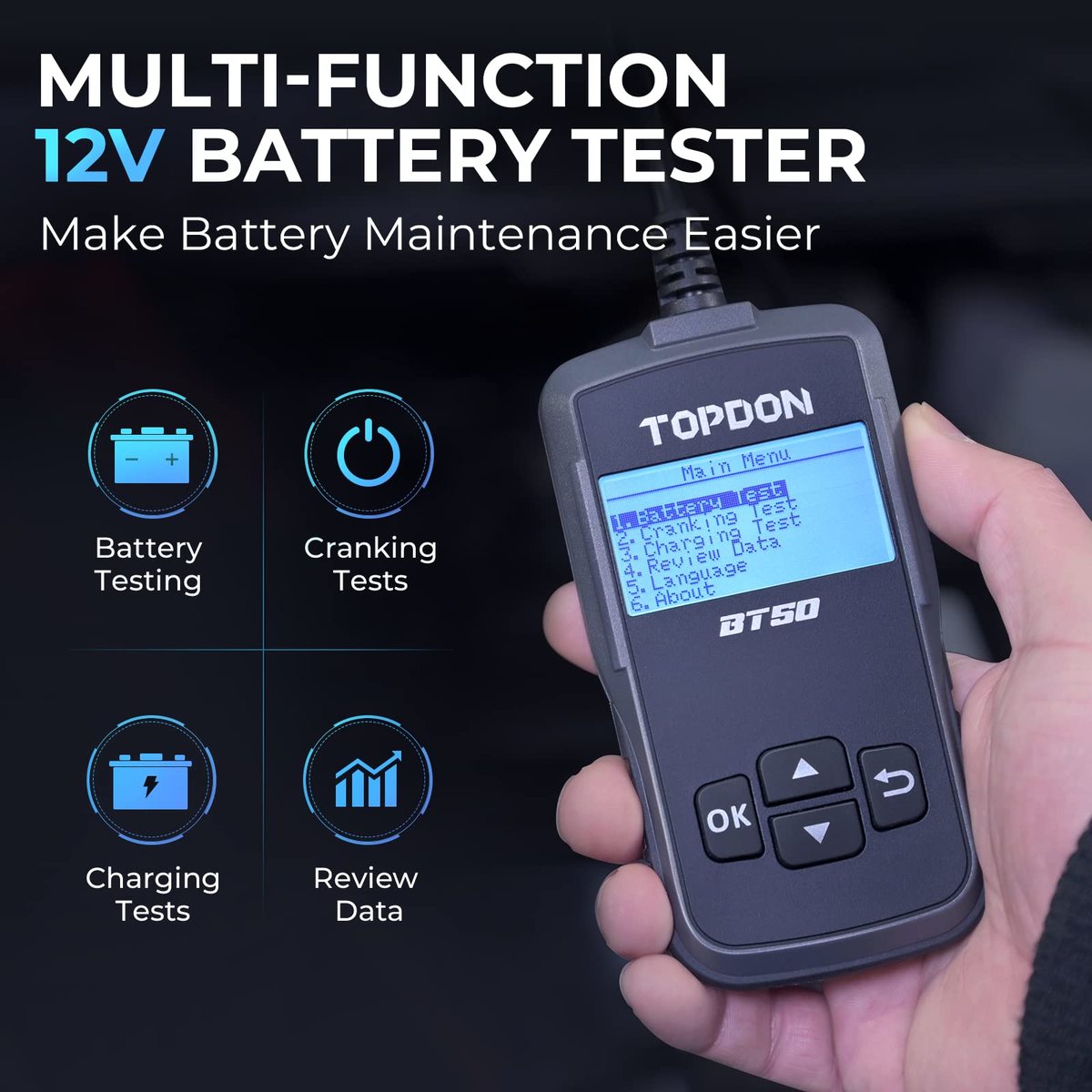 Comprehensive 12V Battery Analysis for Peak Performance: The TOPDON BT50 battery tester is your ultimate diagnostic companion for all 12V lead-acid batteries, delivering professional-grade insights into battery health, cranking capability, and charging system efficiency. With its intuitive data review feature, track historical test results to monitor degradation trends and make informed maintenance decisions?perfect for DIY enthusiasts and automotive professionals seeking a reliable car battery tester with accurate diagnostics,Lightning-Fast Precision for Confident Results: Engineered with cutting-edge conductivity testing technology, the BT50 TOPDON battery analyzer delivers lab-grade accuracy in seconds, outperforming traditional voltage testers. Its upgraded algorithm ensures you catch issues before they leave you stranded. A must-have automotive diagnostic tool for quick pre-road-trip checks or routine battery health monitoring,Spark-Free Safety Error-Proof Design: Prioritize safety with innovative spark-free technology, eliminating explosion risks during testing. Built-in reverse polarity protection guards against accidental misconnections, while anti-overheating safeguards ensure durability. Trust this 12V battery analyzer for worry-free testing on cars, trucks, motorcycles, boats, and more?ideal for home mechanics and professional technicians alike,Global-Friendly Interface for Effortless Operation: Switch seamlessly between six languages (English, Spanish, French, German, Italian, Russian) to navigate tests with clarity. The bright LCD display and one-button operation make it a user-friendly battery tester for all skill levels, empowering users worldwide to diagnose starting issues, validate alternator output, or assess AGM/flooded battery lifespan without confusion,After-Sales Service: Invest with confidence?TOPDON?s BT50 battery tester comes with a 12-month wa-rranty and lifetime access to technical support. Join thousands of satisfied customers who rely on this good battery diagnostic tool for its road-tested reliability. Whether prepping for winter or troubleshooting a no-start, it?s the battery tester built to keep your vehicles running smoother, longer