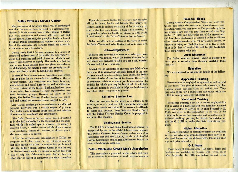 A 6 panel fold out brochure. Welcome Home Brochure published by the Dallas Veterans Service Center in Dallas, Texas. Circa 1940's. with information on Insurance, disability, Jobs, training, GI Loans and much more,