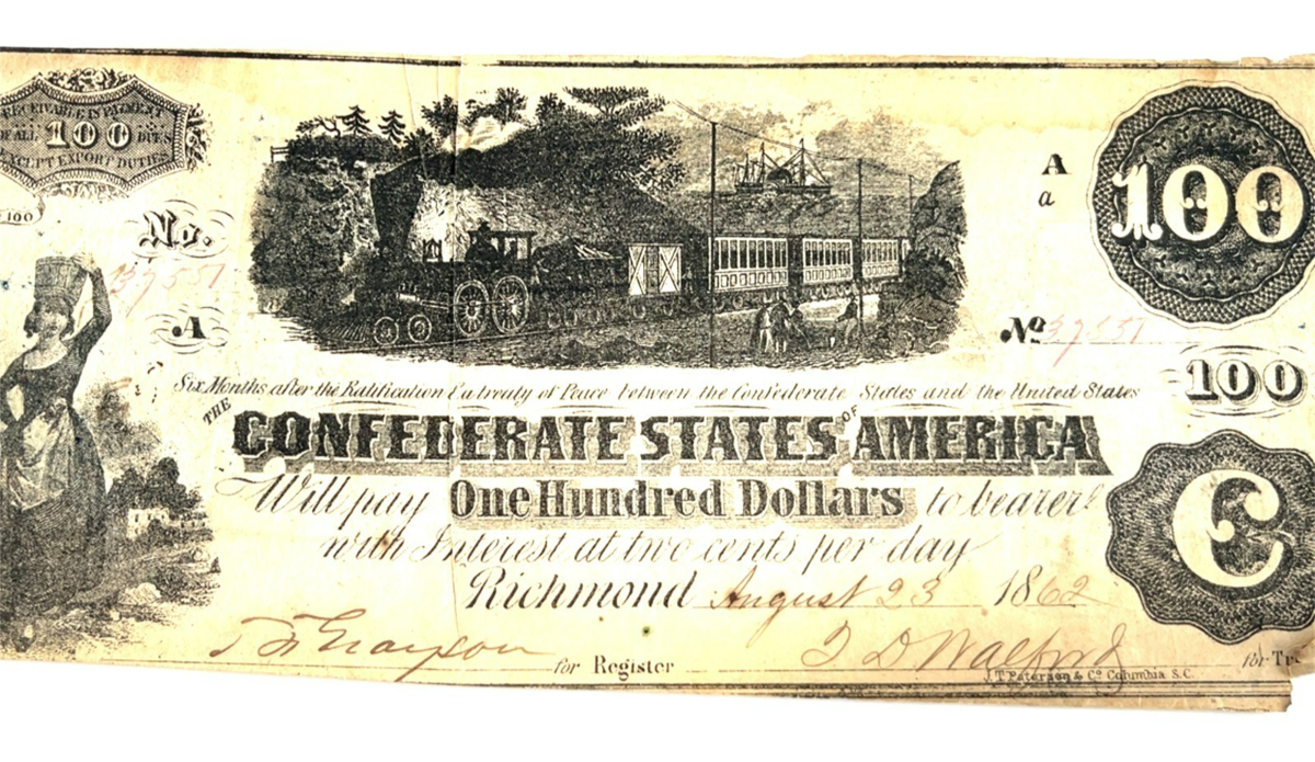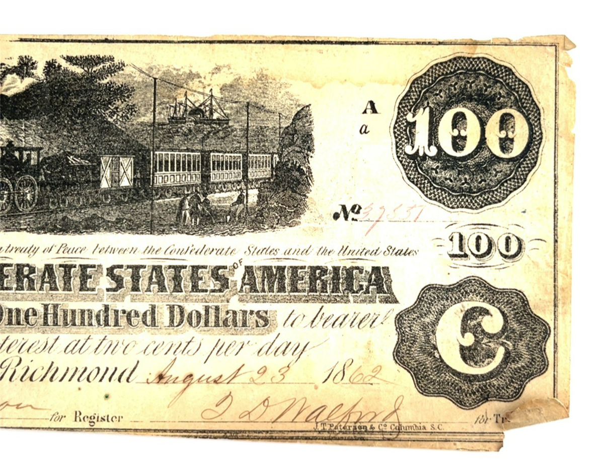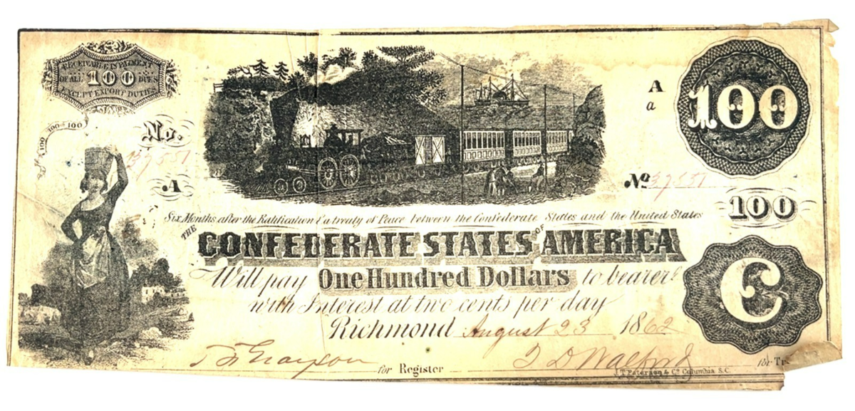 1862 $100 Confederate States of America Civil War Currency T-40 “Train” Note XF