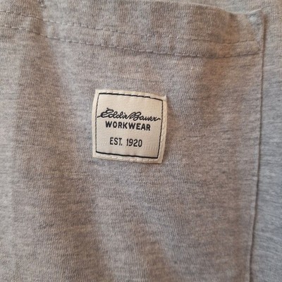The Eddie Bauer Workwear Shirt is a versatile men's long sleeve t-shirt in a stylish gray heathered color. Made from a blend of polyester and cotton, this knit shirt features a crew neckline, logo accents, and convenient pockets. Suitable for all seasons, including winter, fall, and spring, it offers easy care with machine washable fabric. The classic outdoor workwear theme makes it a timeless and practical addition to any man's wardrobe, representing quality craftsmanship from the 2010-2019 period.