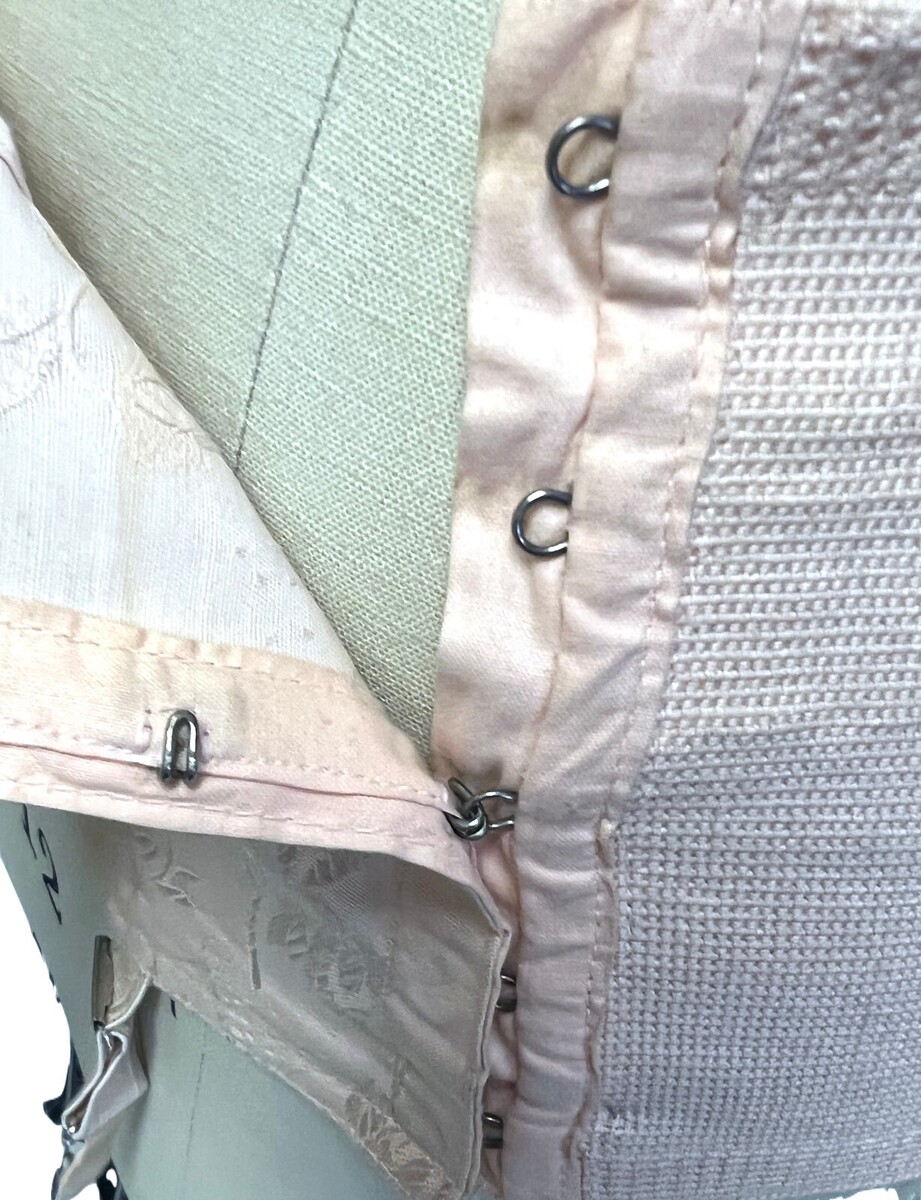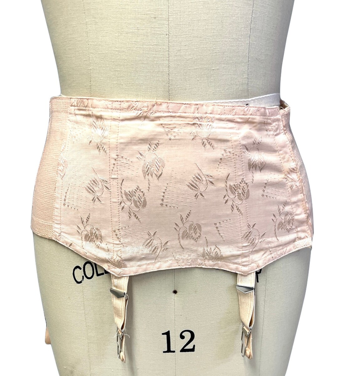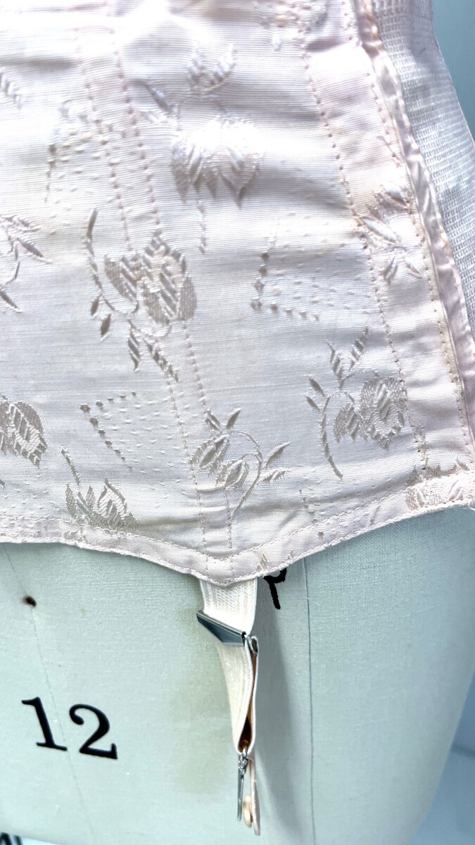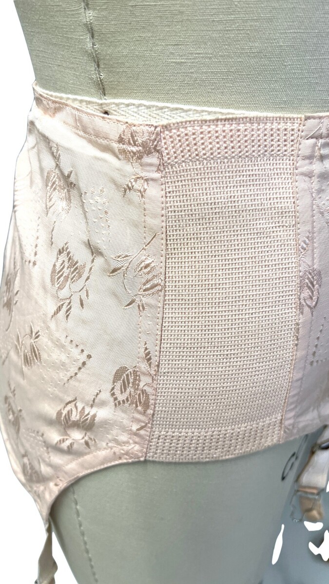 Vintage PINK Floral Cotton Rayon Open Bottom Girdle in pink shiny floral Damask sz 32 Garter Belt, in excellent condition! No label for maker, but the size and material are printed on the hem. V4098 model. About 9 1/2" long in back. All 4 garters are present.