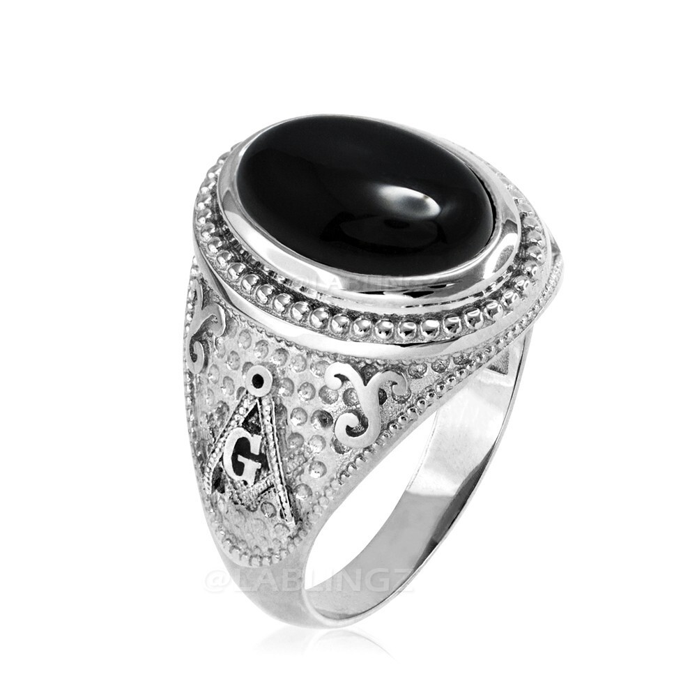 Sterling Silver Masonic Statement Ring with Oval Black Onyx Cabochon Gemstone