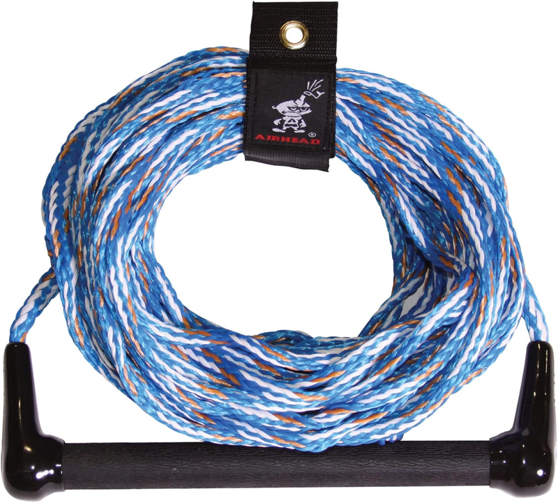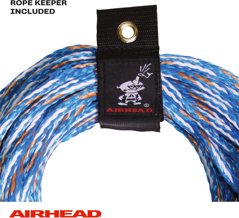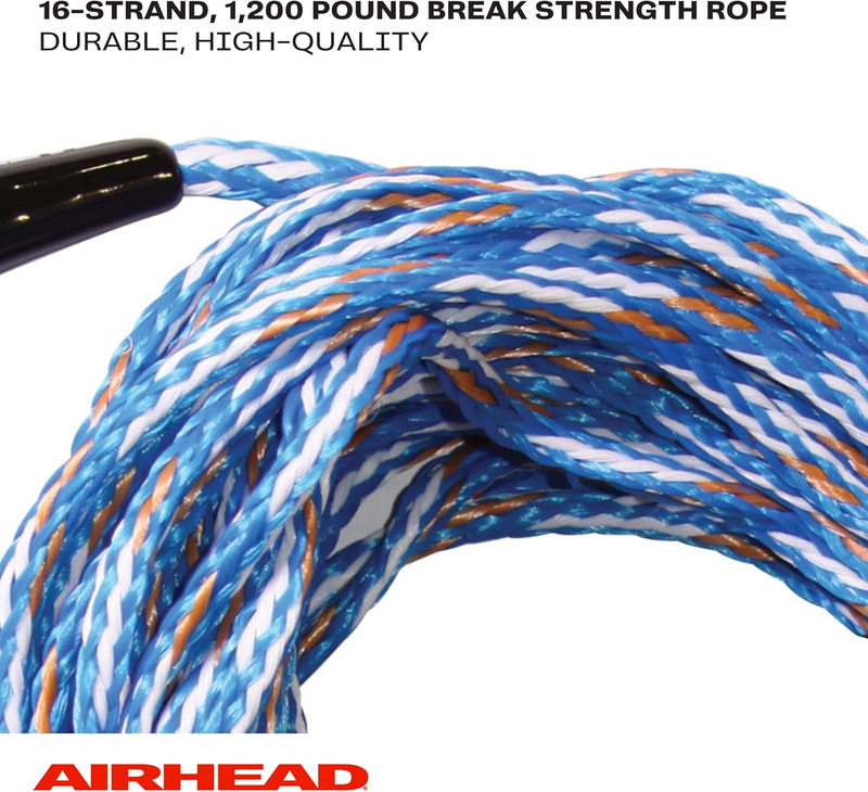 Need a water ski rope for long days and minimal muscle discomfort? The Airhead 3 Section Radius Handle Water Ski Rope features a 17 degree, 13-inch radius aluminum core handle, which allows a more natural grip. Plus, the soft patterned EVA grip wraps the handle and full-length finger guards provide a solid, unmistakable hold. This 16-strand, UV-treated three-section water ski rope has multiple options for use. Take it skiing, wakeboarding, or kneeboarding at 75, 60, or 45 feet. Each section is a different bright, stunning color for optimum visibility. The encased crossover yoke protects the rope from high abrasion wear areas. A Rope Keeper is included for tangle-free storage.