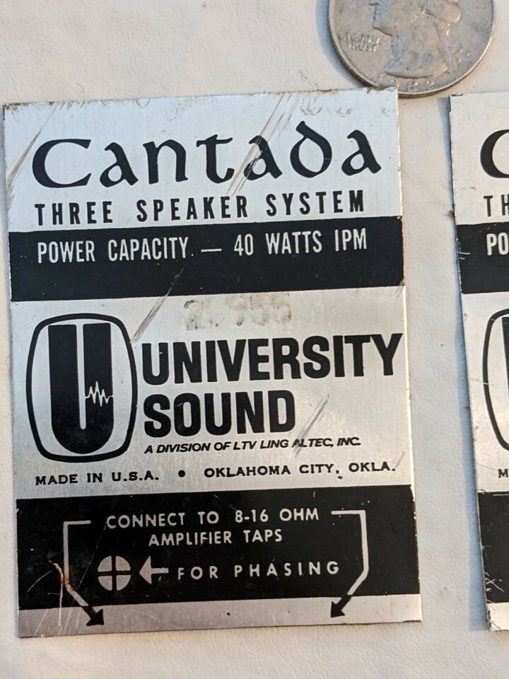 Lot of 2 Vintage University Sound Cantada Three Speaker System Badge LTV Altec