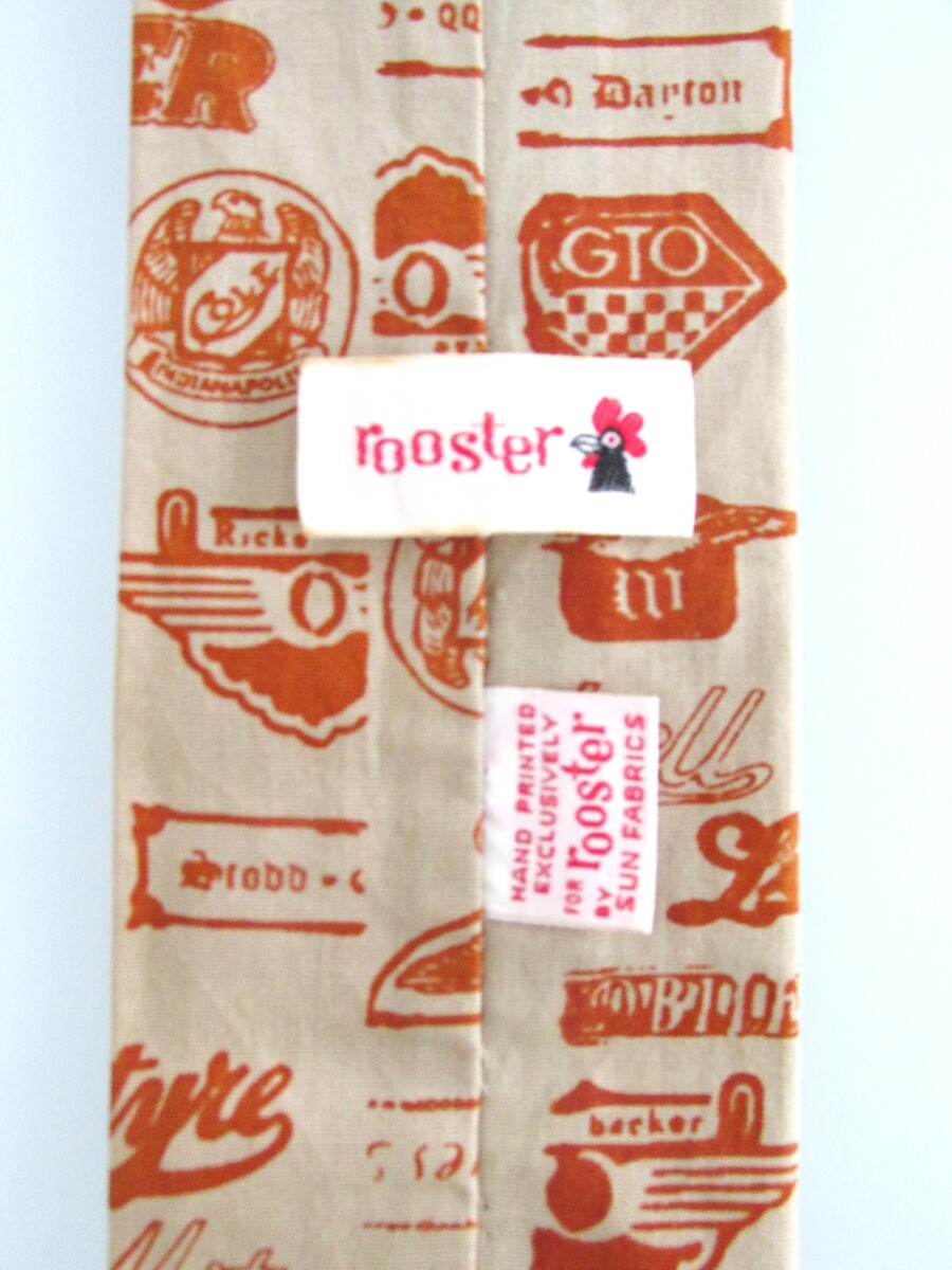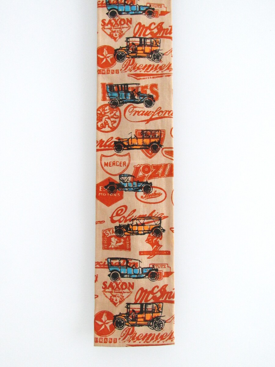 Description: Up for sale is a Rooster brand vintage flat square bottom men's cotton tie. This tie is made of 100% cotton. It has a car motif in blue, yellow, black orange on a light tan background. Dimensions are 54" long x 2.75" wide. This tie is in excellent condition.