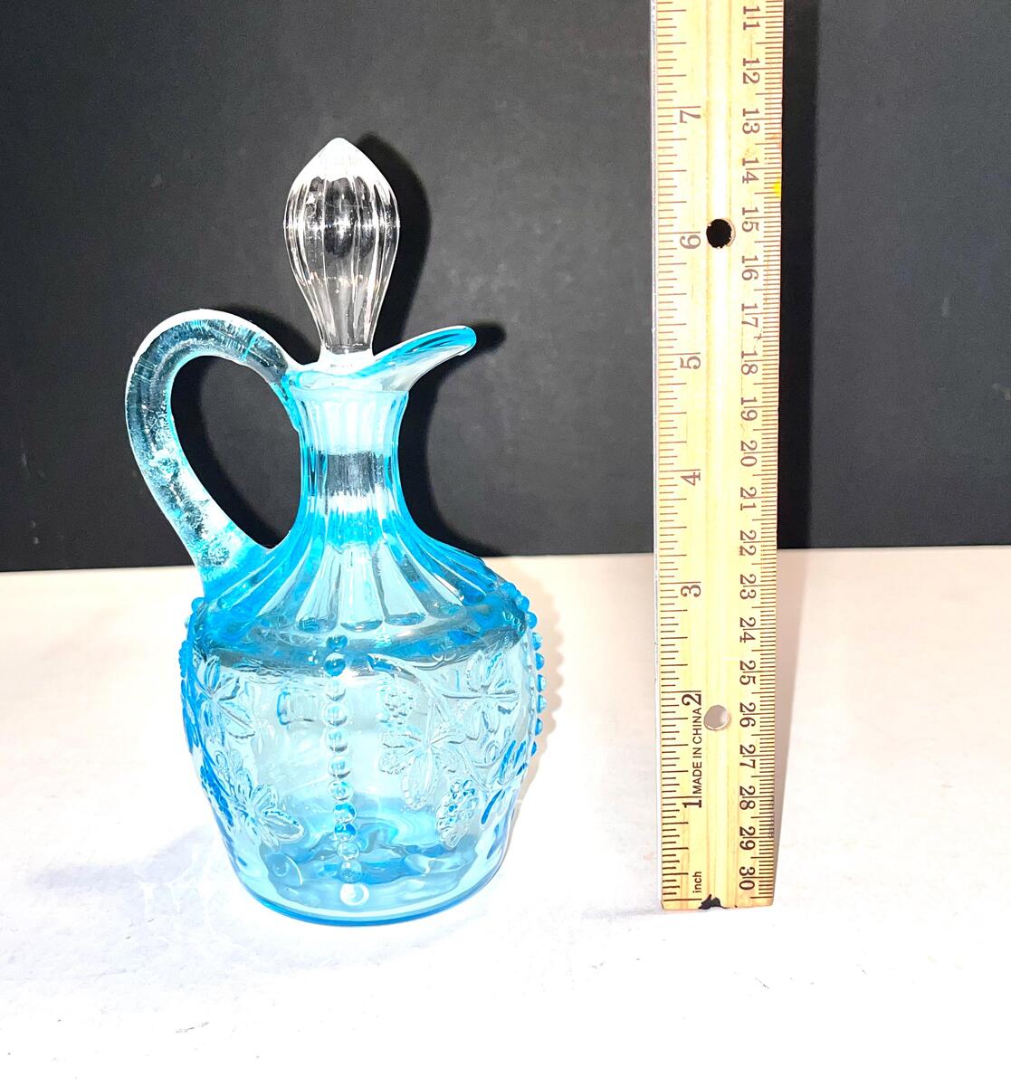 This image features a rare example of Northwood's "Daisy and Fern Swirl" pattern cruet. Produced between approximately 1898 and 1903 by the prominent American Northwood Glass Company, this small decorative bottle utilizes popular late-Victorian blue opalescent glass. The raised botanical motif and subtle color fading are characteristic signs of its age and authenticity. This historical item is free of damage.