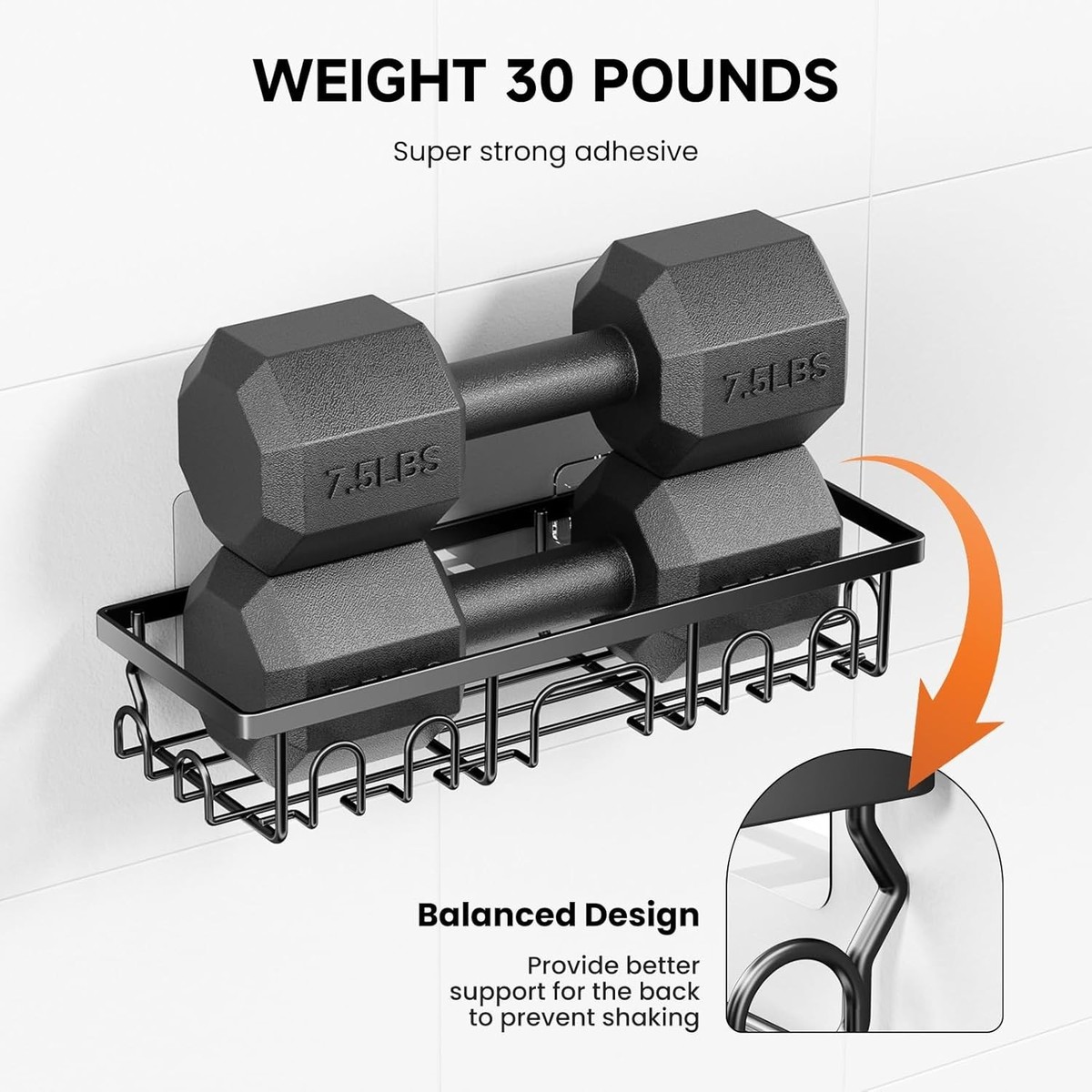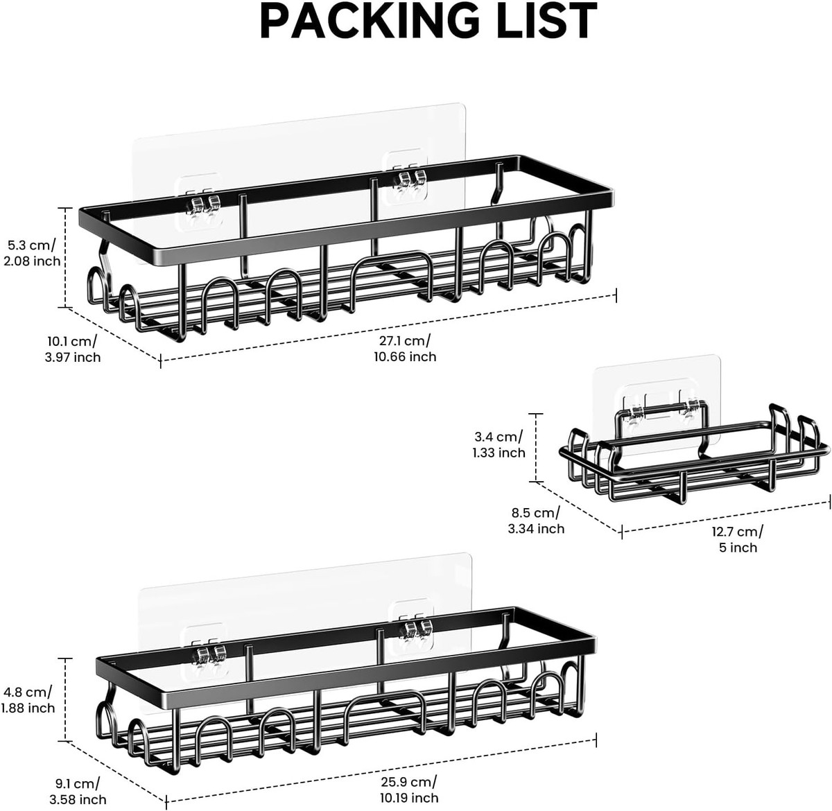 Includes 2 shower shelves, 1 soap holder, and 3 high-strength adhesives.