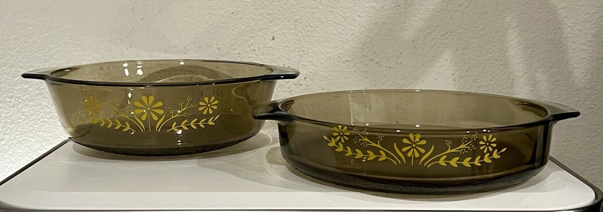 Vintage Glasbake Set Of 2 Round AMBER Casserole Dish & Pan Yellow Daisy pattern