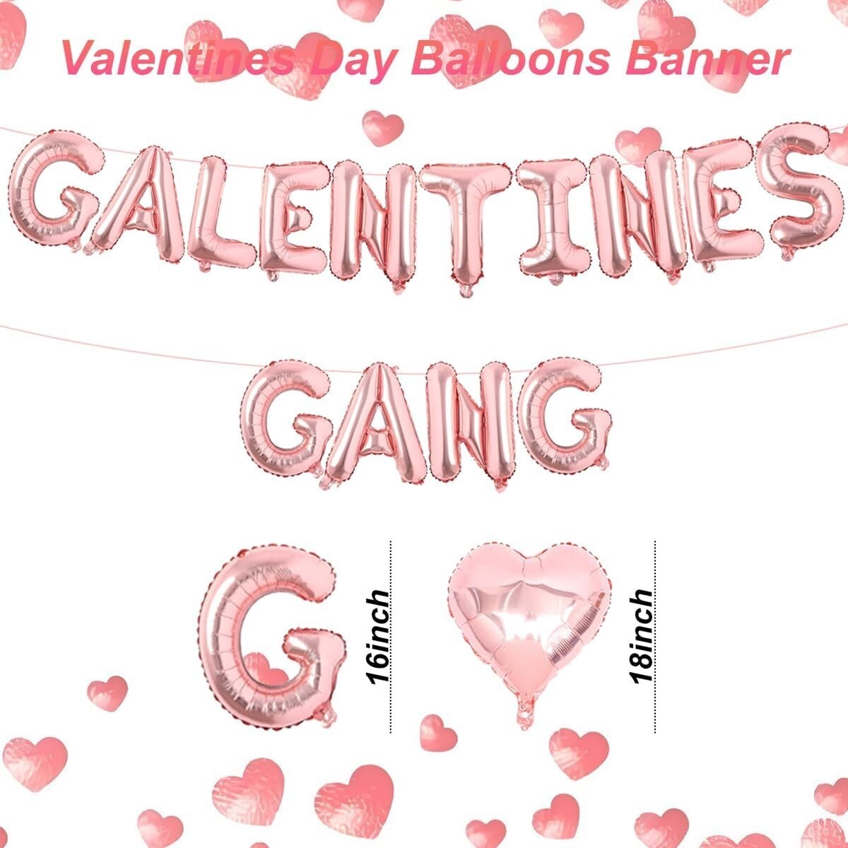 Set includes 14pcs of 16-inch rose gold letter balloons spelling out "GALENTINES GANG" and 4pcs of 18-inch rose gold heart balloons.