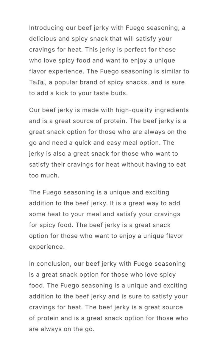 The beef jerky is a great snack option for those who want to satisfy their cravings for something tangy and spicy. The beef jerky is a great snack option for those who are always on the go or for those who want to satisfy their cravings for something tangy and spicy.