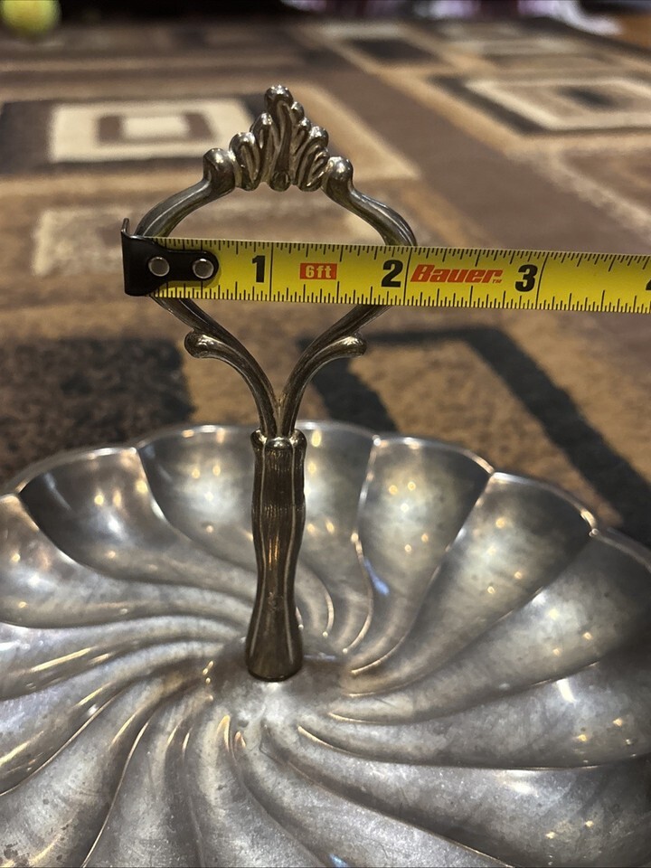 This antique silver appetizer platter is a small yet elegant piece with a handle, perfect for serving appetizers or desserts in style. Made from silverplate with a Victorian style decor pattern, this platter is a charming addition to any antique collection or dining table. Its age is unknown, adding to its timeless appeal and rustic charm.