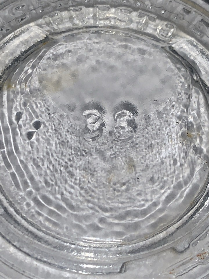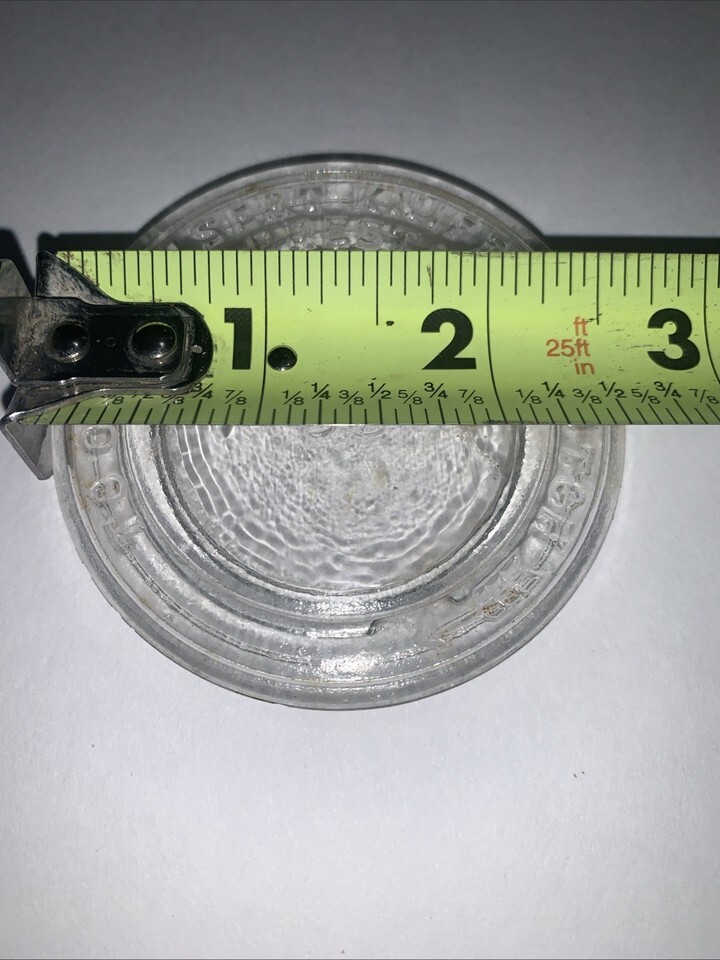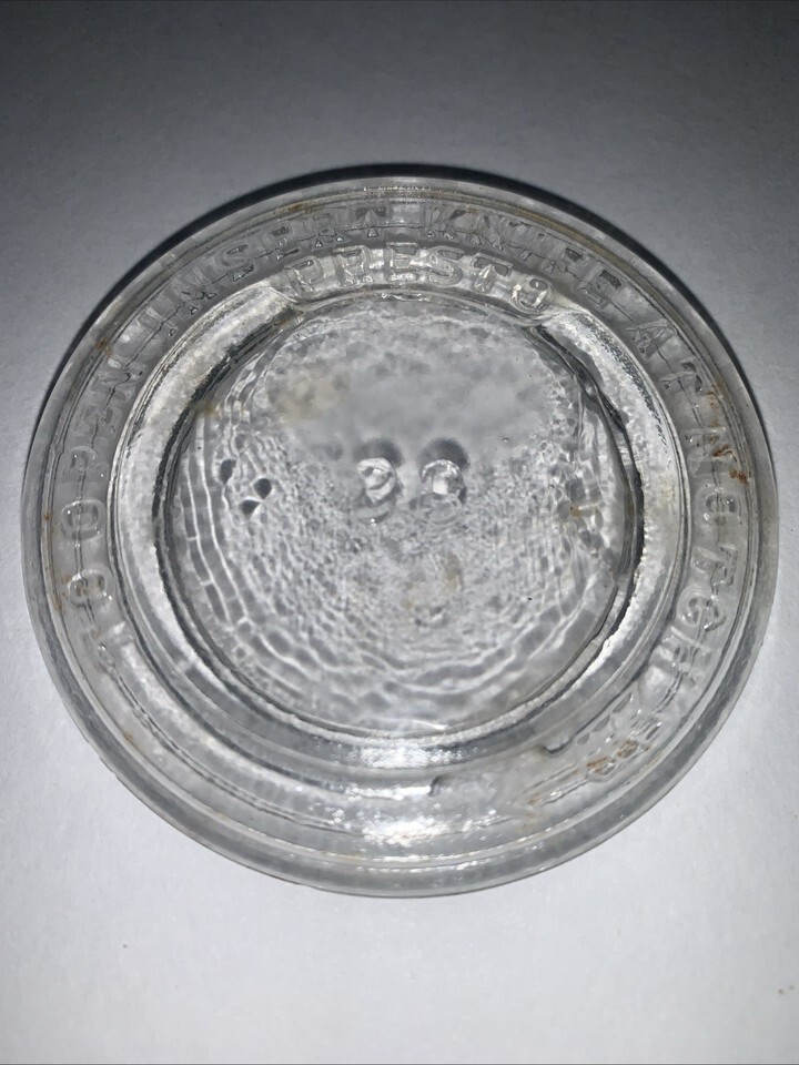 The vintage Presto glass canning jar lid features a classic design with a 36 inch center. This clear glass lid was manufactured in the United States, specifically for use with pint-sized jars. Perfect for collectors of vintage bottles and jars, this Presto lid adds a touch of nostalgia to any collection with its simple yet timeless design. Ideal for those looking to complete their set of modern collectible jars, this lid is a must-have for any enthusiast of vintage kitchenware.