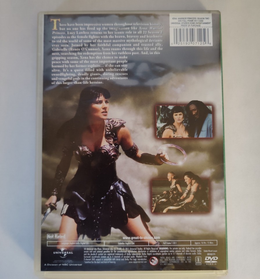 The Xena: Warrior Princess - Season Two DVD set, released in 2011, includes all episodes from the second season of the popular television series. The 5-disc set features English language with English subtitles, produced by Bernadette Joyce, Chloe Smith, Chris Manheim, Emily Skopov, and Michael Macdonald. Directed by various directors including Charles Siebert, Anson Williams, and Michael Hurst, this action-packed TV show is set in ancient Greece and follows the adventures of the warrior princess Xena. Produced by Universal Studios, this DVD set is a must-have for fans of Xena: Warrior Princess.