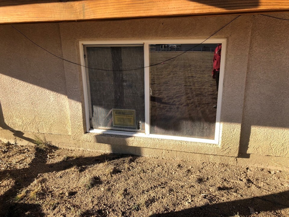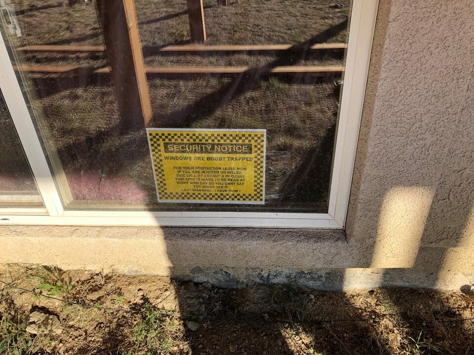 WARNING SIGN HOME SECURITY SYSTEM THIS WILL BE EXIBIT A IN COURT THIS WINDOW IS PROTECTED