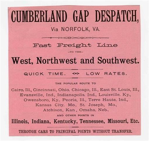 An Original 1890's Railroad Ad. Original 1890's Cumberland Gap Despatch Railroad Ad Via Norfolk Virginia from a Transportation Publication. This ad highlights The Fast Freight Line to the West, Northwest and Southwest., Quick Time and Low Rates. Measures about 6" x 5 3/4".