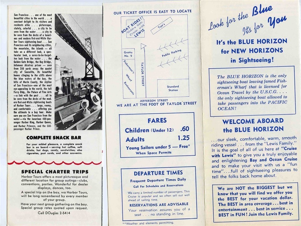 There are 2 different brochures in this lot from the 1950's. 2 San Francisco Bay Cruise Brochures . An illustrated 4 panel Red White Fleet brochure with photos, information, route map ,fares and more. And an illustrated 6 panel for the Blue Horizon Bay and Ocean Cruise with photos, Fares, route map, information and more.