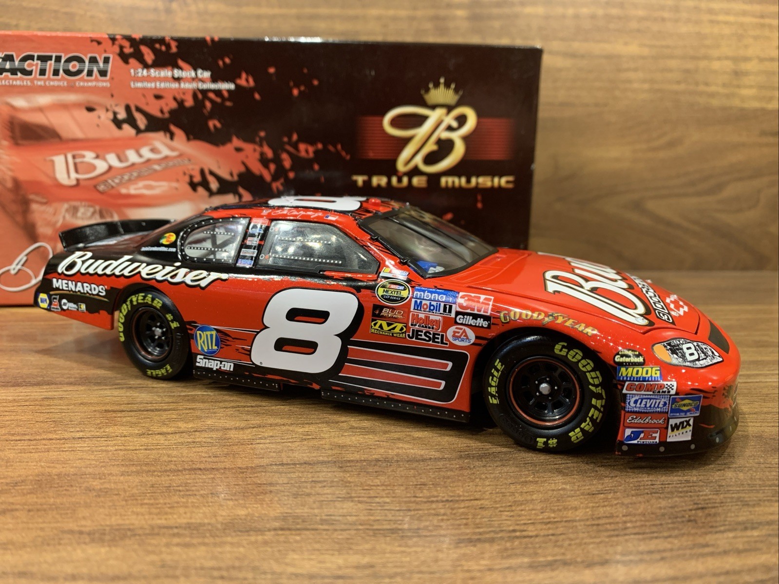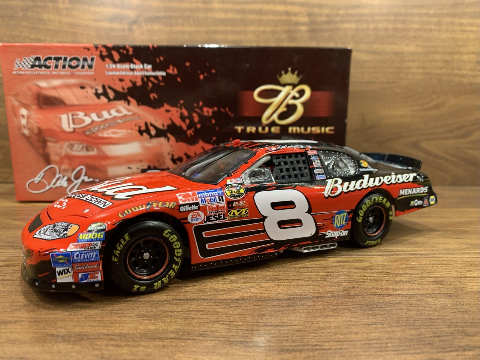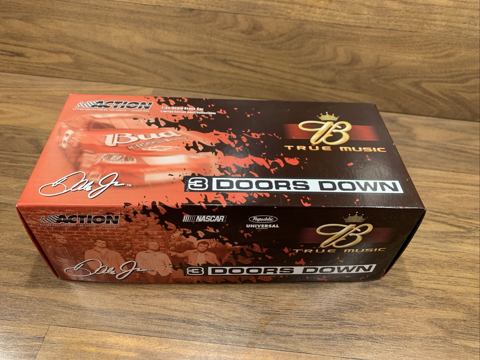 The product is a limited edition 1:24 scale diecast replica of Dale Earnhardt Jr's #8 Budweiser Chevrolet Monte Carlo from the 2005 NASCAR season. This special edition car features a multi-color paint scheme with the theme of the music band 3 Doors Down, making it a unique collectible for adult fans of both NASCAR and music. Produced by Action, this advertising specimen showcases the iconic Budweiser branding and is a must-have for any racing enthusiast's collection.