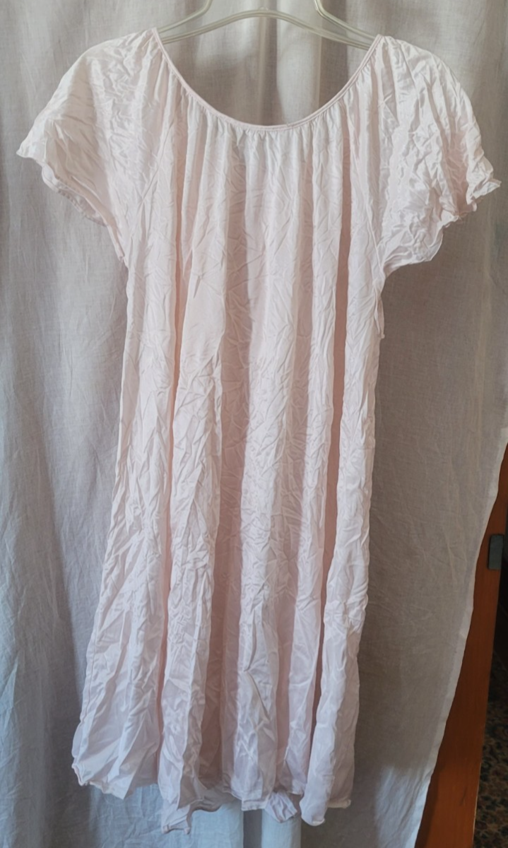 This nightgown is in good used condition. There are no holes or stains that I found. The material does show wear from use and washing. The tags are missing so the brand and the size are unknown. Measurements are approximately: Length: 40 inches. Pit to Pit: 27 inches.