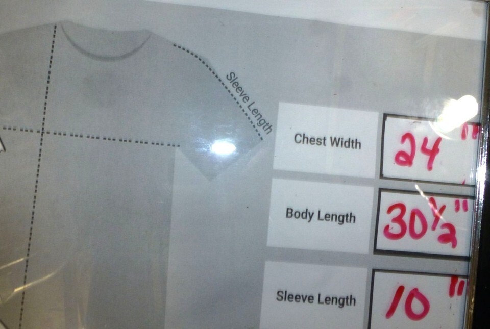 Spots of discoloration on fabric as shown in pics. Chest width = 24 inches, Body length = 30.5 inches, Sleeve length = 10 inches