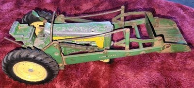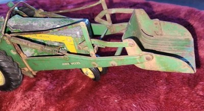 Vintage John Deere toy tractor with loader. Well played with. Missing the steering wheel. Do not see any brand markings but believe it to be a Eska. Classic Deere toy.