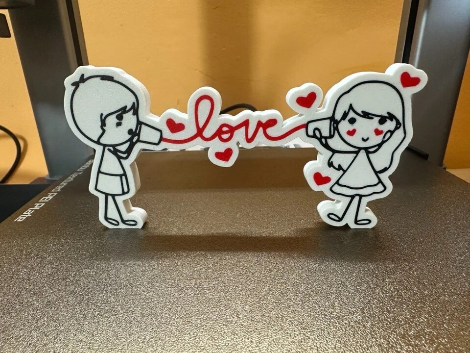 Celebrate romance with this charming 3D printed love sign. This delightful figurine features a boy and girl sharing a message through a classic tin can telephone, with the string spelling out 'love' in vibrant red. Crafted with detailed black outlines on a white base, the freestanding piece is accented with small red hearts. It's a perfect and unique gift for Valentine's Day, an anniversary, or to simply add a touch of romantic decor to any room.