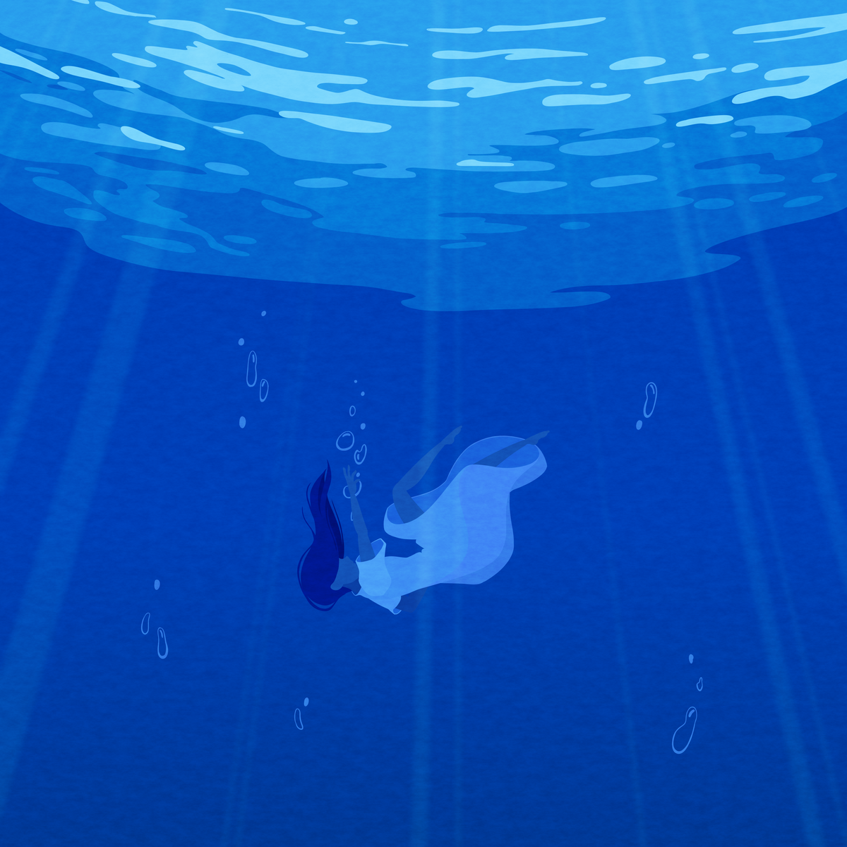 Drowning in Blue shows a lone figure slowly sinking into an endless field of blue, capturing a quiet and heavy sense of sadness. The girlโs white dress contrasts with the surrounding darkness, symbolizing fragility as she is gradually consumed by the deep. There is no struggle or sign of rescue, making her descent feel unavoidable. The blue becomes more than waterโit represents an overwhelming emotion that pulls her downward, reflecting how despair can feel like a slow, silent sinking rather than a sudden collapse.